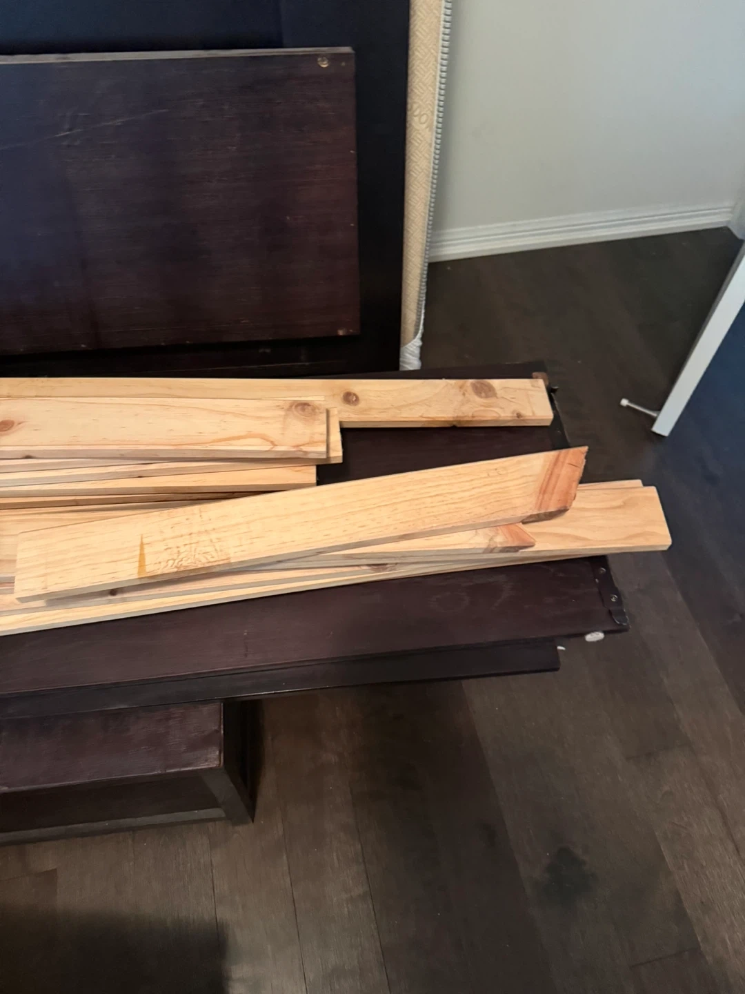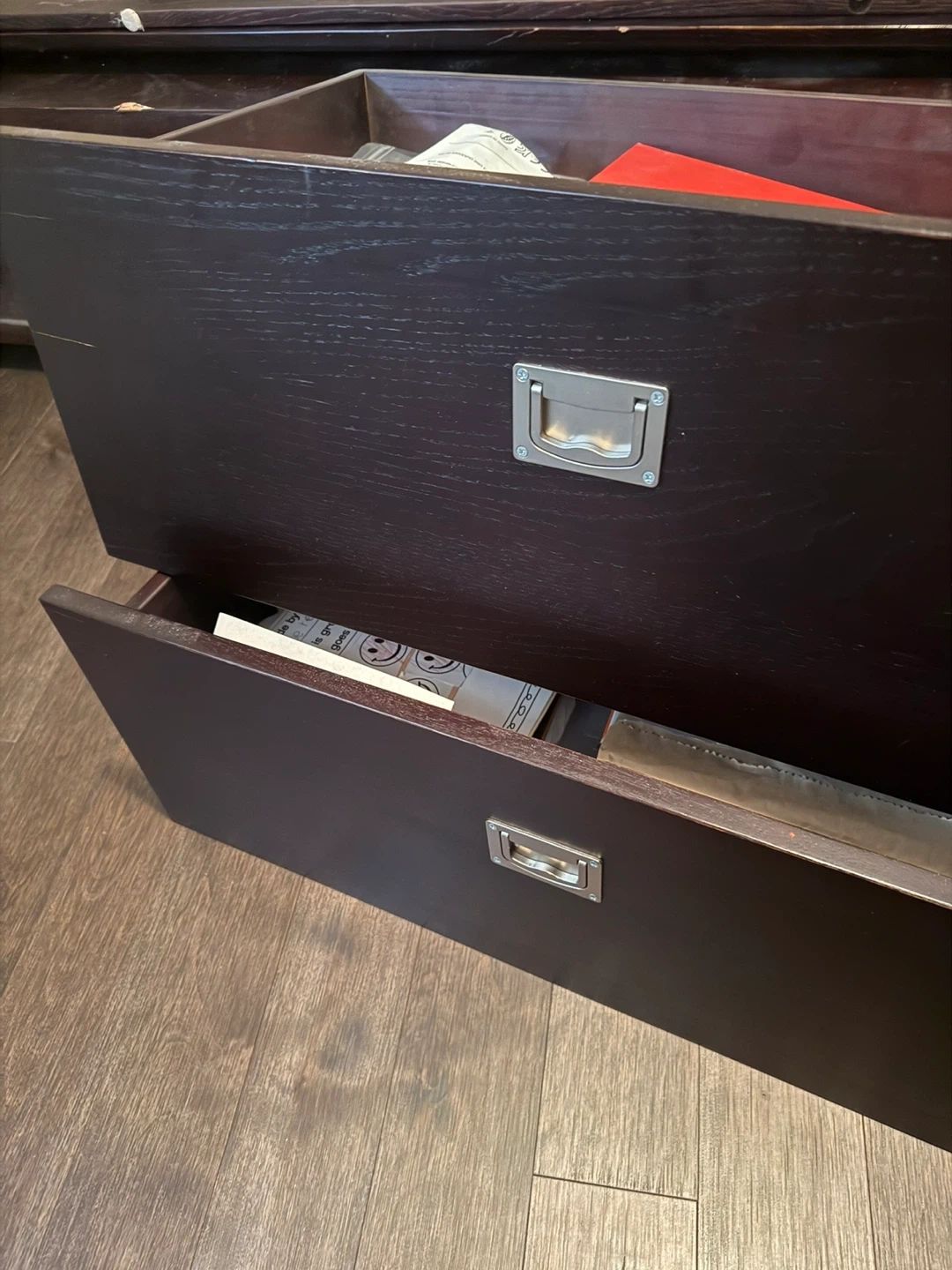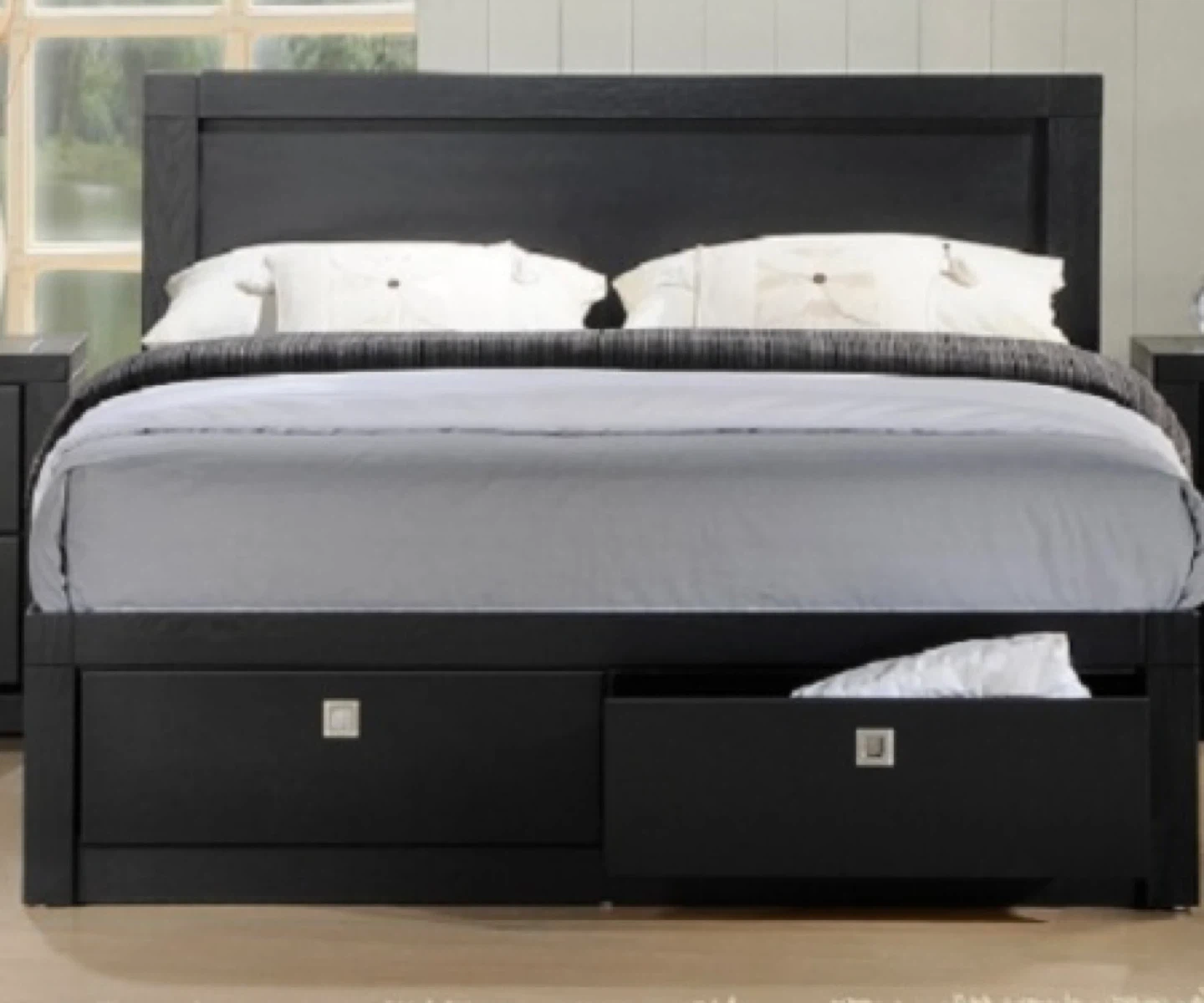 Queen size bed frame in a dark wood finish. It features two large storage drawers built into the base. Slats are included for mattress support.