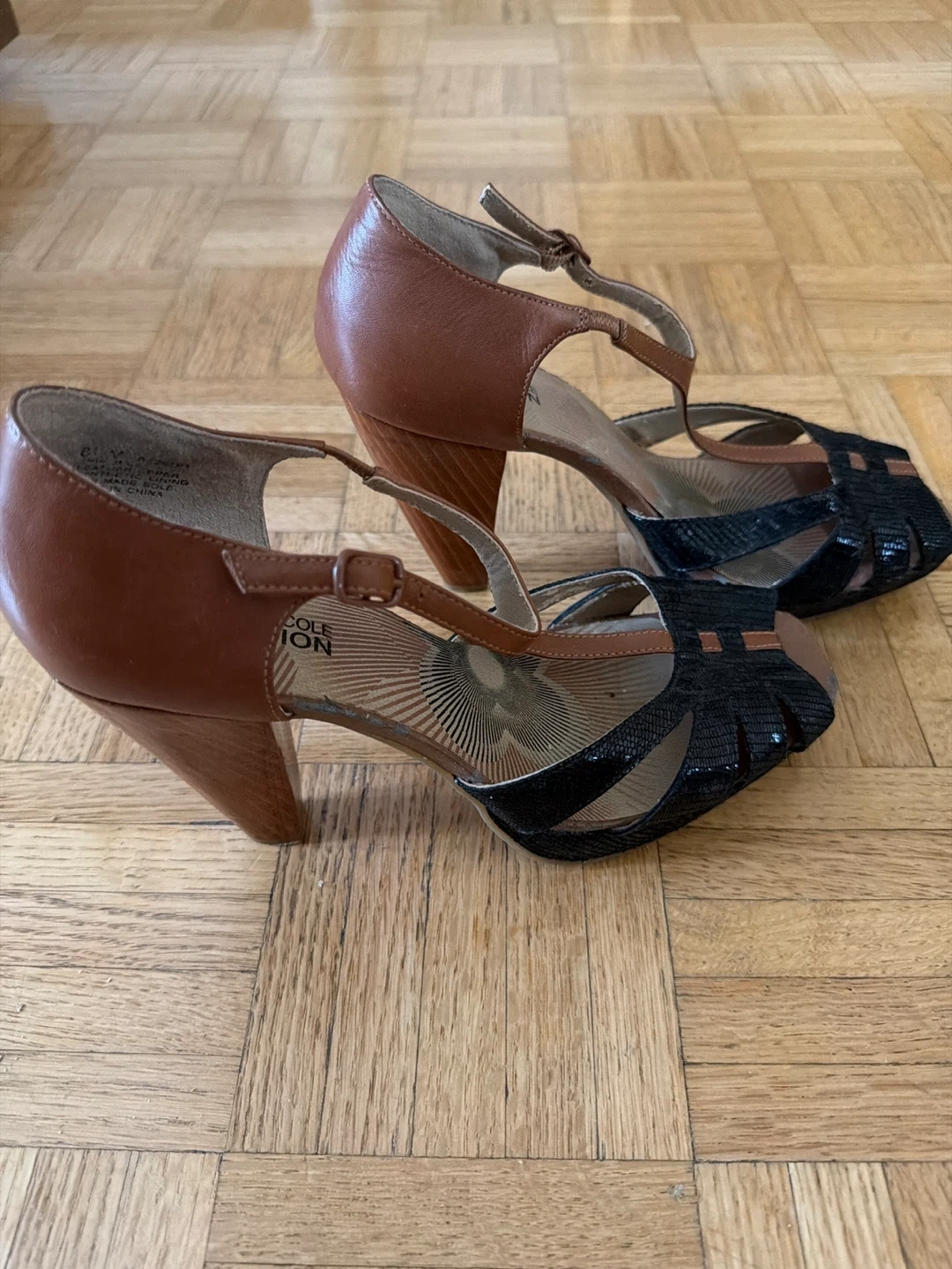 These Kenneth Cole Reaction heeled sandals feature a brown leather upper with black sparkly open-toe accents. Heel height is approximately 3.5 inches. Buckle closure on the ankle strap.