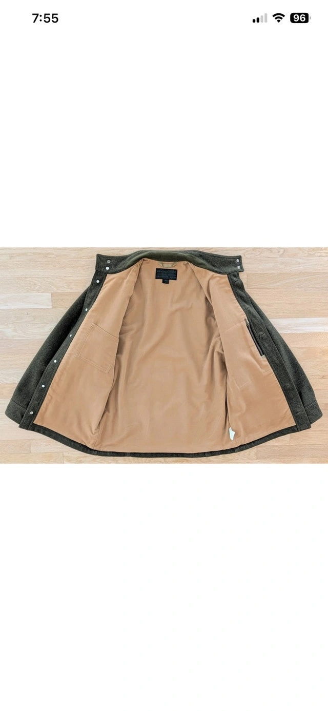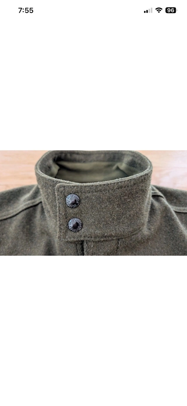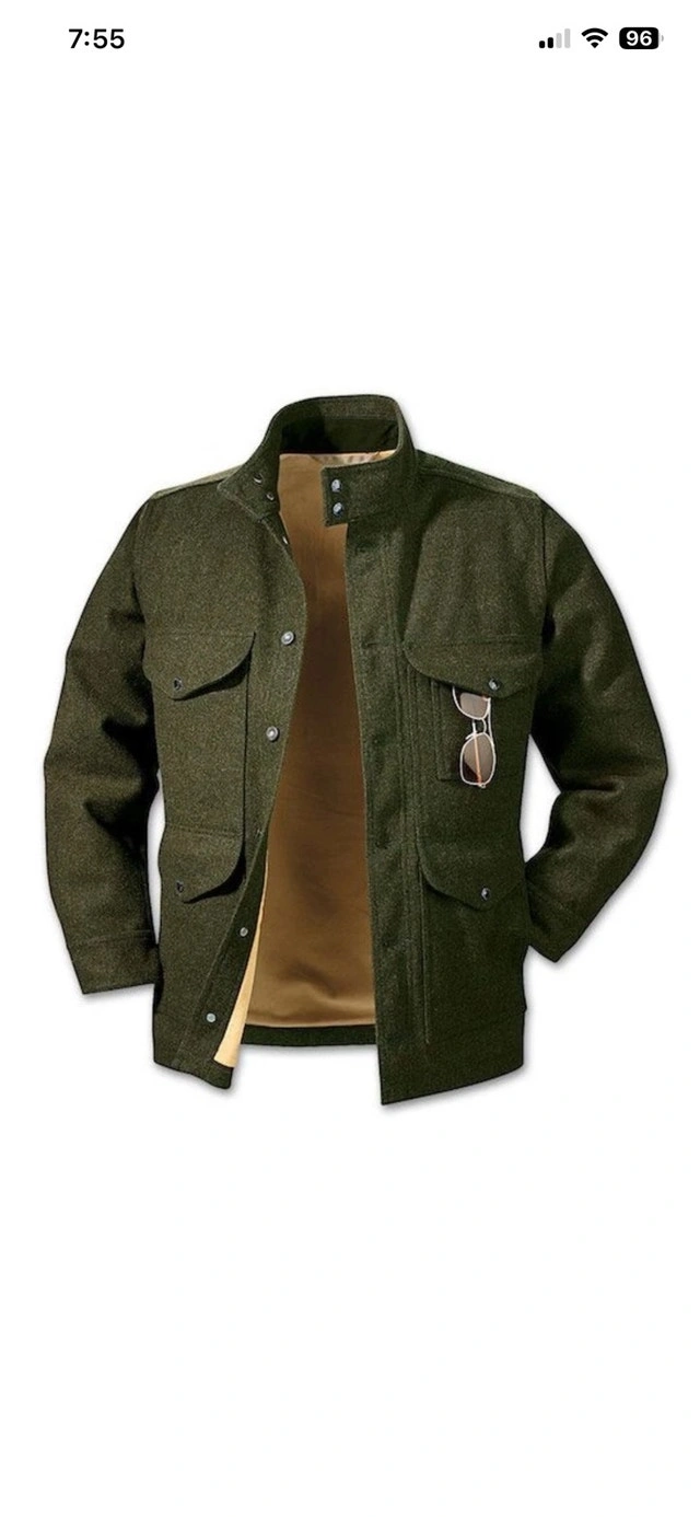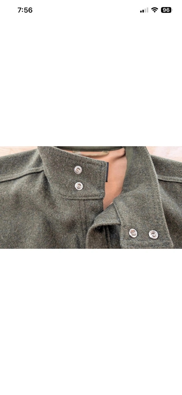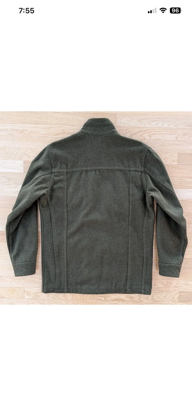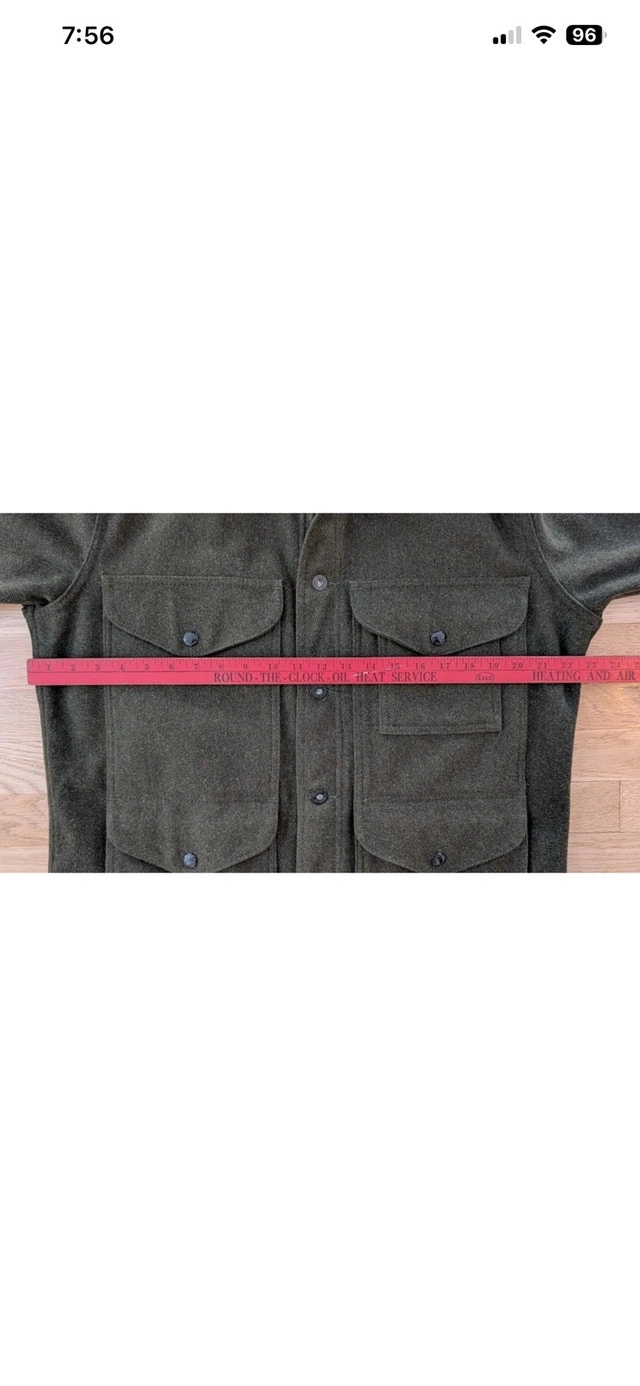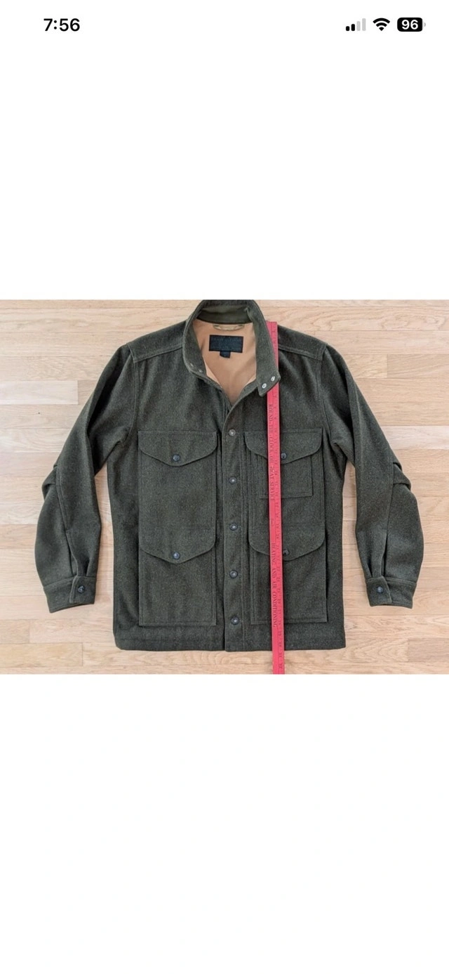 RARE Filson Greenwood Green Wool Cruiser Jacket, size medium. This item is in basically NEW Condition. It's also been discontinued, so this is a rare find. A heavy, rugged Yukon wool jacket with soft cotton moleskin lining and a plethora of pockets. The virgin Yukon wool in this jacket will absorb as much as 30% of its own weight in moisture without becoming damp or clammy. As a result, the jacket will handle light rainfall and retain your body warmth even when wet. For added comfort and warmth, the Greenwood features cotton Moleskin and polyester linings while its standing collar helps block cold and wind. Filson gave the Greenwood a Seattle fit which means the Greenwood has a tailored fit allows room for mobility through the shoulders and enables the jacket to sit comfortably close to your body. It's a versatile look that's built for the outdoors but cut for the city. Four front flap pockets with snap closures, a lower left compass pocket, an internal zippered pocket, and an internal patch pocket. Three utility slots on upper left pocket 100% virgin Yukon wool Cotton Moleskin body lining Polyester taffeta sleeve lining Seattle fit Double snap closure Standing collar lined with cotton Moleskin Four front flap pockets with snap closure Three utility slots on upper left pocket Lower left compass pocket, internal zippered pocket, and internal right patch pocket Dry clean only Made USA