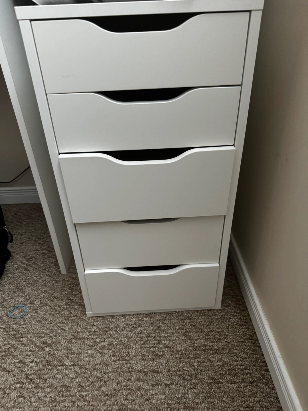 White storage organizer with five drawers. Great for organizing small items in a bedroom, office, or bathroom.