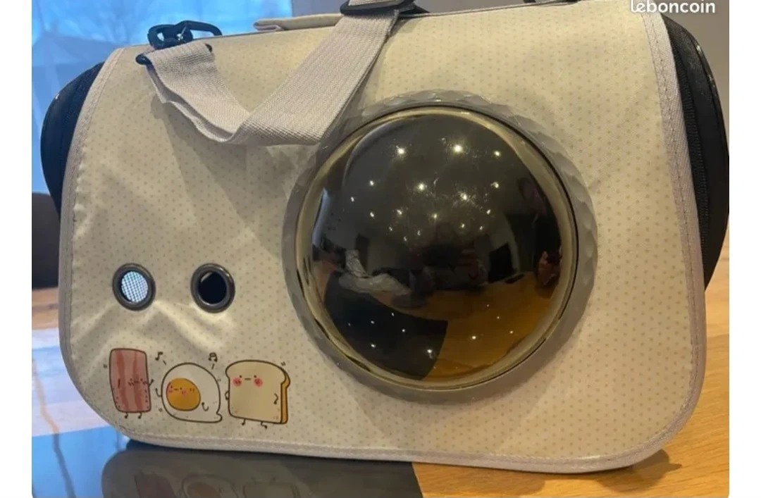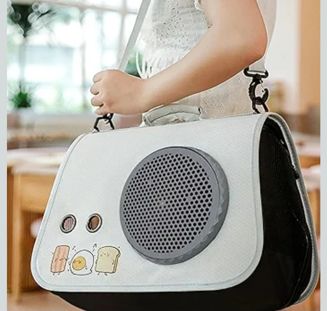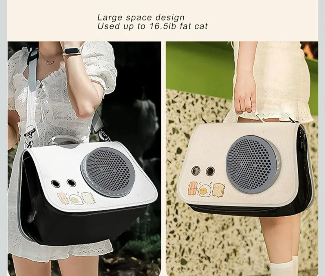 Cute cat carrier bag with a bubble window for your pet to see out. It has a large space design and's suitable for cats up to 16.5lb. Features a ventilation fan and cute toast and egg graphics!
