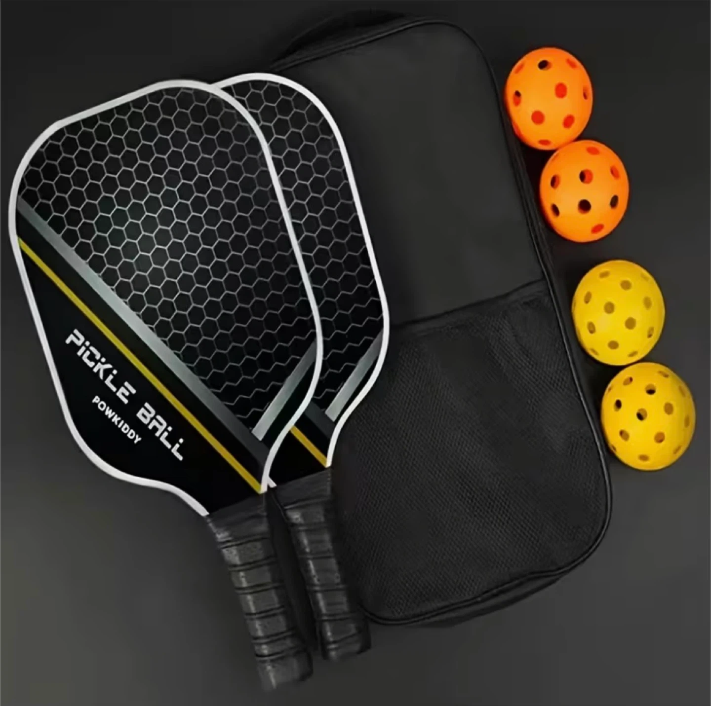 This set includes two pickleball paddles, three pickleball balls (one orange, two yellow), and a black carrying bag. The paddles feature a honeycomb pattern on the face and comfortable grip handles. It's great for outdoor and inside play!
