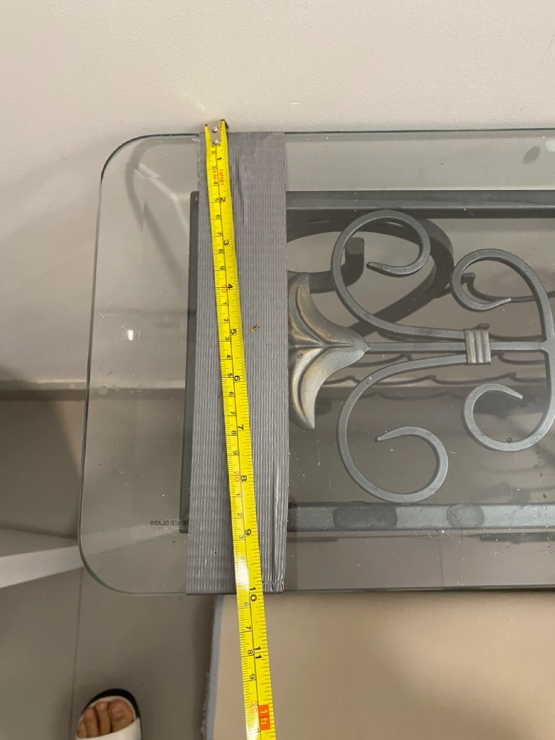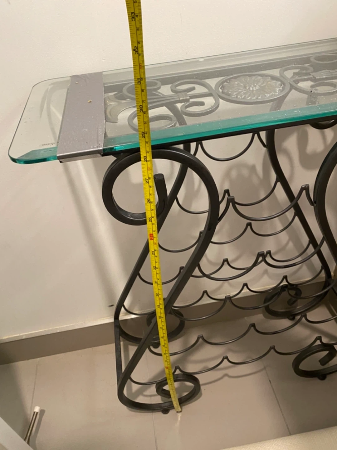 This wine rack table features a glass top and decorative metal scrollwork. It has a metal frame with a capacity for multiple wine bottles. It's a unique piece for your home!