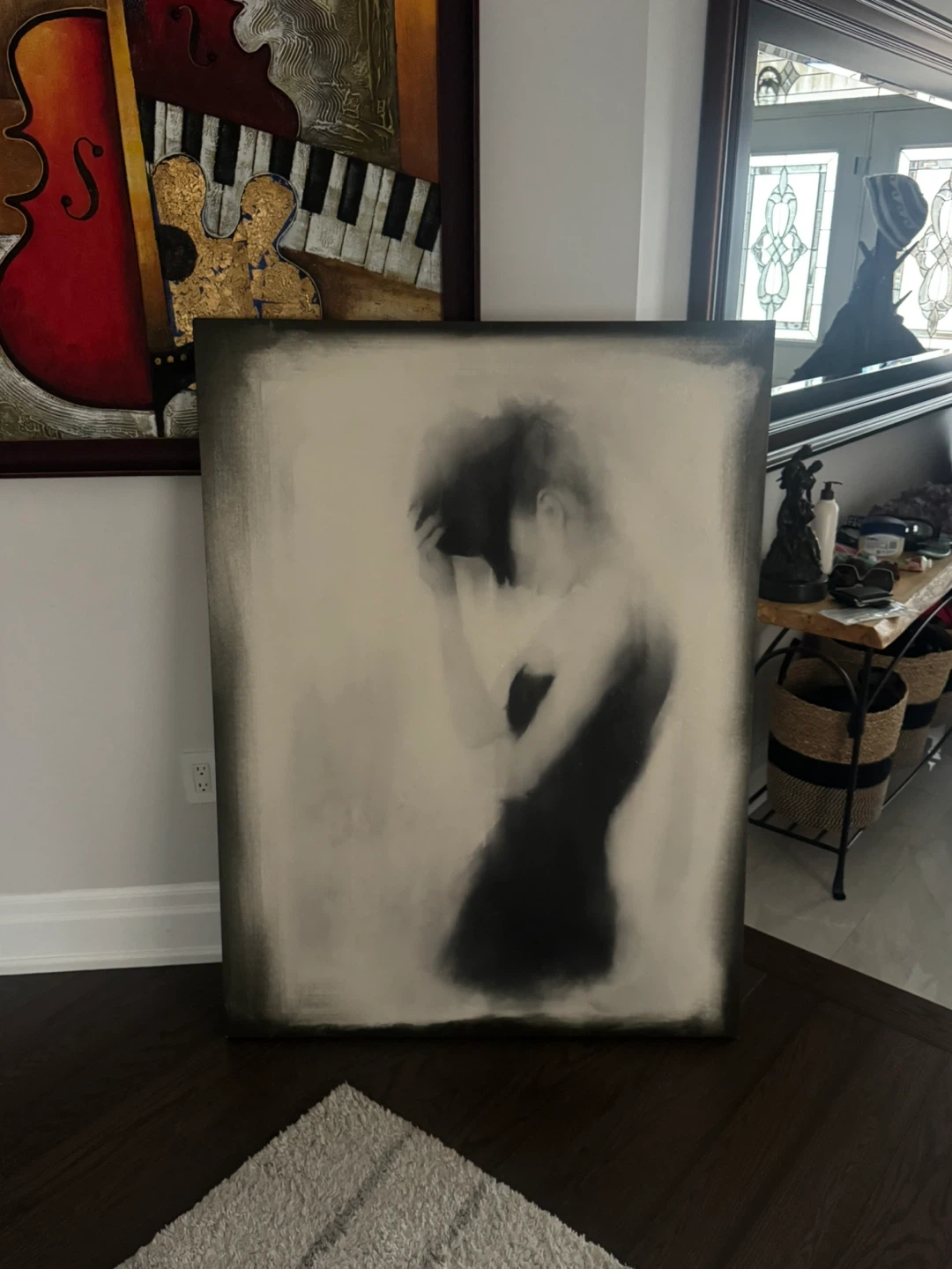 The selected region features a blurred monochrome artwork that appears to be "Femme Fatale", an acrylic art print available through Maison Corbeil – Must Société. The piece is characterized by the soft-focus silhouette of a woman, designed to evoke a sense of strength and mystery through its mural-style presentation