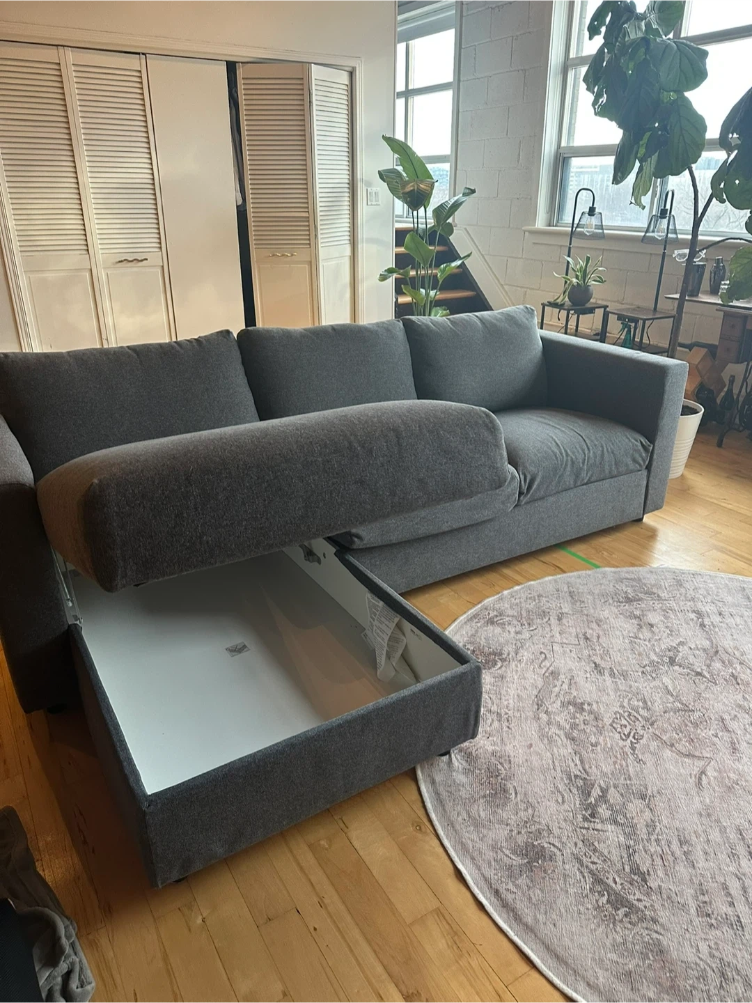 This grey sectional sofa (IKEA Finnala) features a chaise for extra lounging. Moved to a new space and this couch no longer fits. It’s in great condition and I am sad to part with it!
