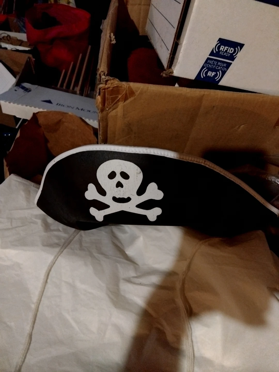 A black pirate hat featuring a white skull and crossbones emblem. It has a white trim around the brim and adjustable white ties. This hat's great for costumes or pretend play!