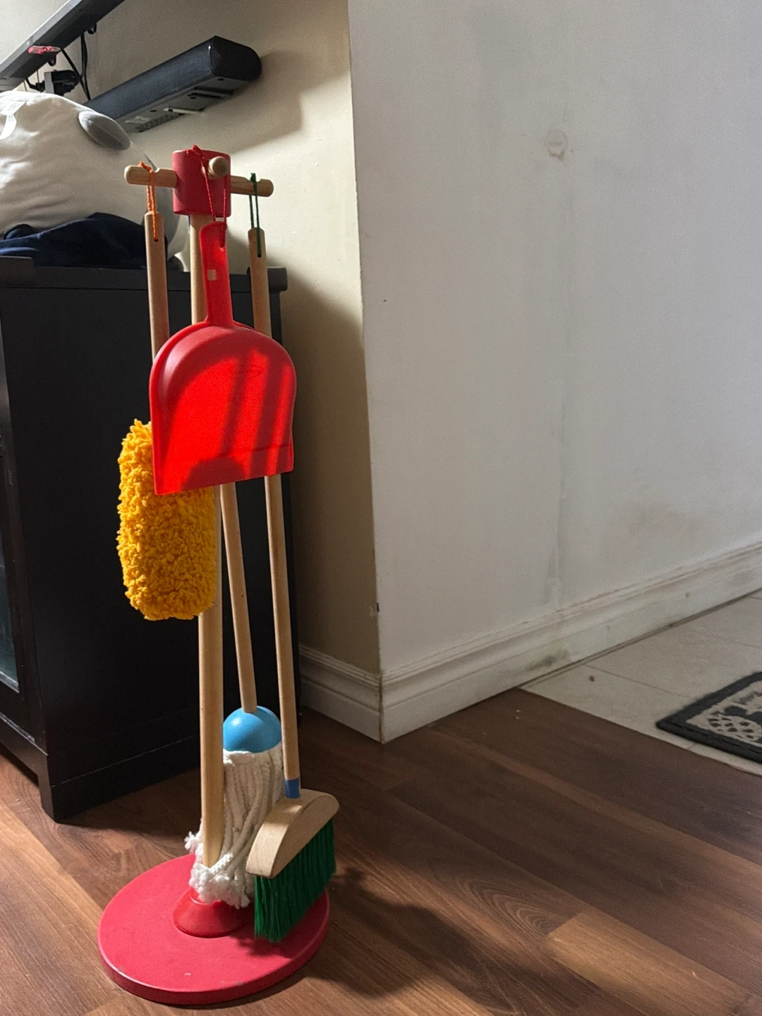 This is a wooden toy cleaning set for kids. It includes a mop, broom, dustpan, and a fluffy duster. The set is designed for imaginative play and tidying up little messes.