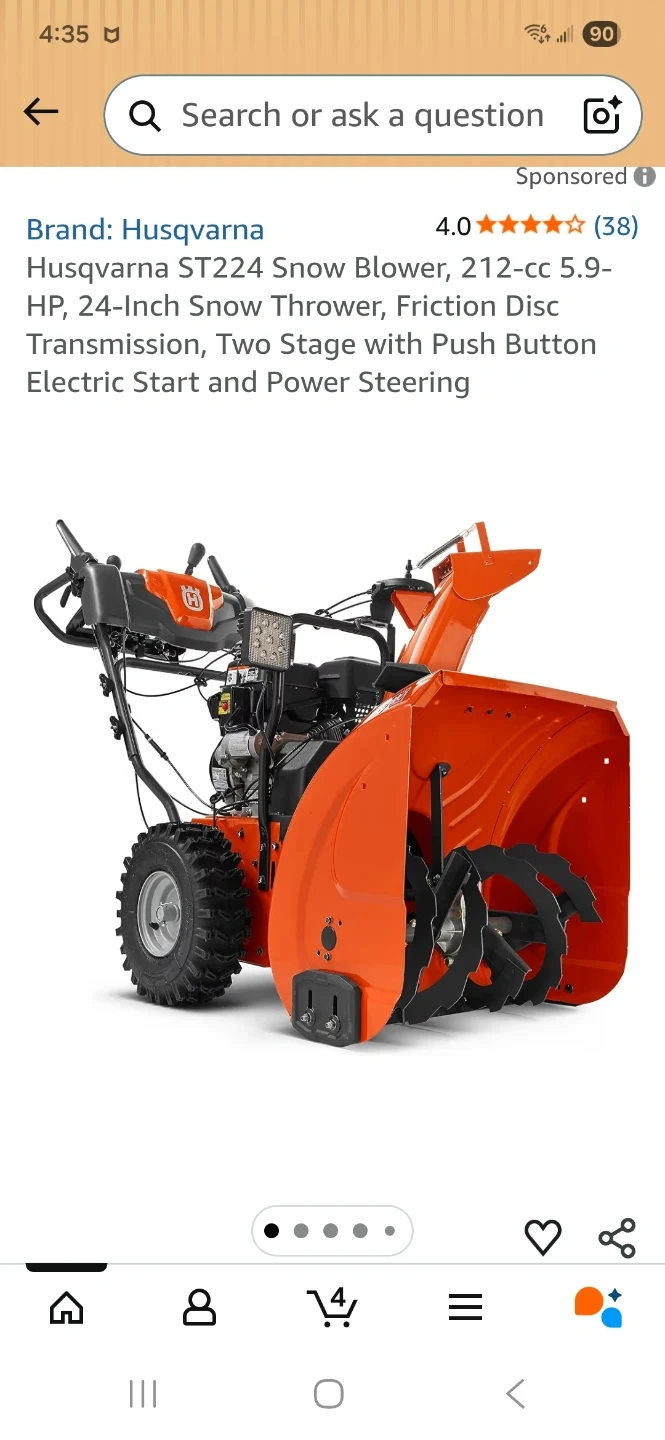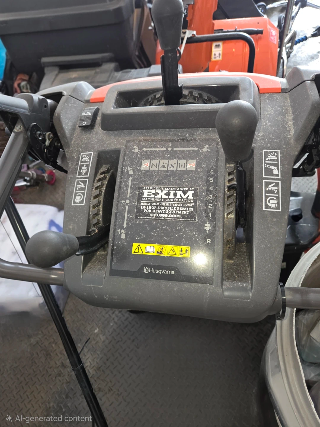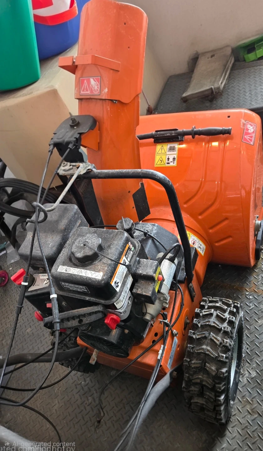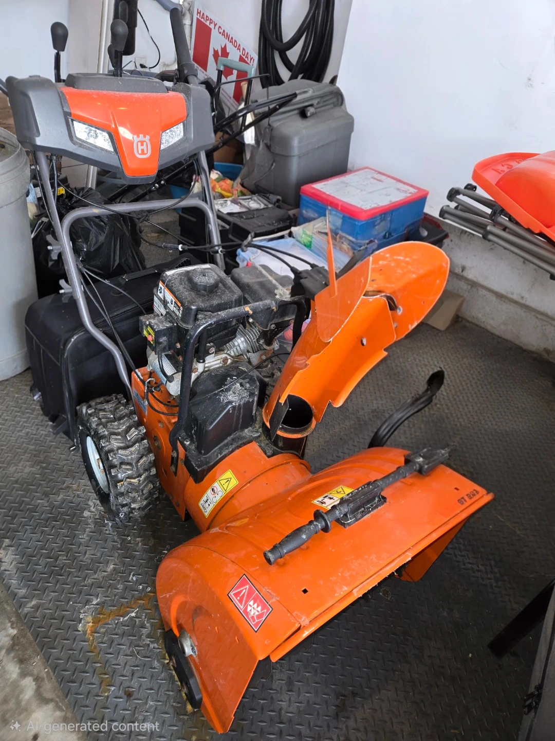 This is a used orange Husqvarna snow thrower, model ST 224. It features a gas-powered engine and large wheels for maneuverability. Perfect for clearing driveways and sidewalks after a snowfall! Bright lights and handle warmers for night time snowing clearing. Does not "blow" snow, it "throws" snow for neater snow clearing than snow blowers. Working condition. Used only once this year due to hired snow removers. No longer needing such a large, heavy duty machine to clean the edges after the plowers come.