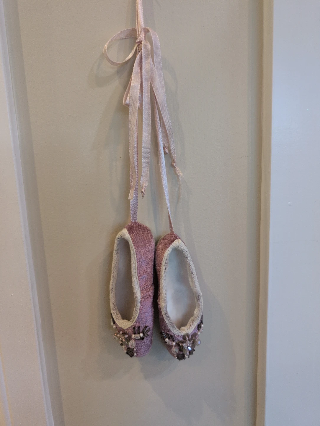 These are cute decorative ballet slippers, likely for ornamental use. They're embellished with beads and sequins. These slippers would make a lovely addition to a dancer's room or as a charming gift.