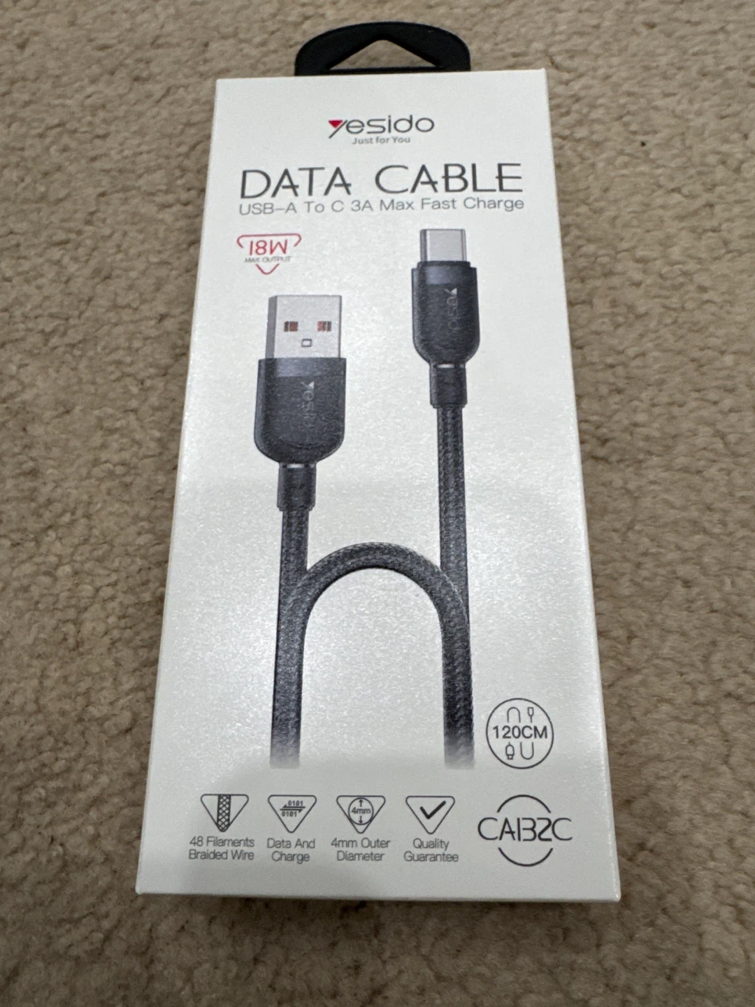 This is a Yesido USB-A to C data cable. It supports 3A max fast charging with 18W max output. The cable is 6ft long and features 48 filaments in its braided wire. It has a 4mm outer diameter.