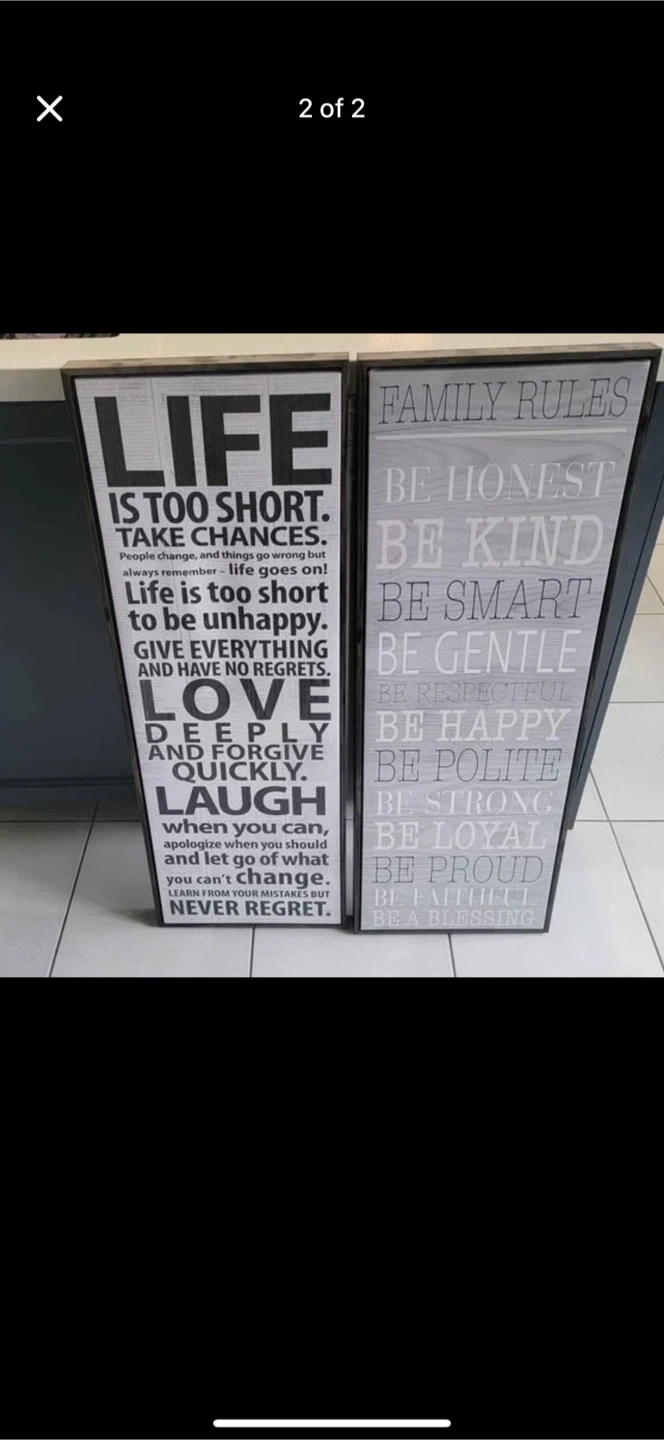 I have two framed wall art pieces. One says 'Life is too short' and the other lists 'Family Rules'. They're in great condition and would add a nice touch to any room