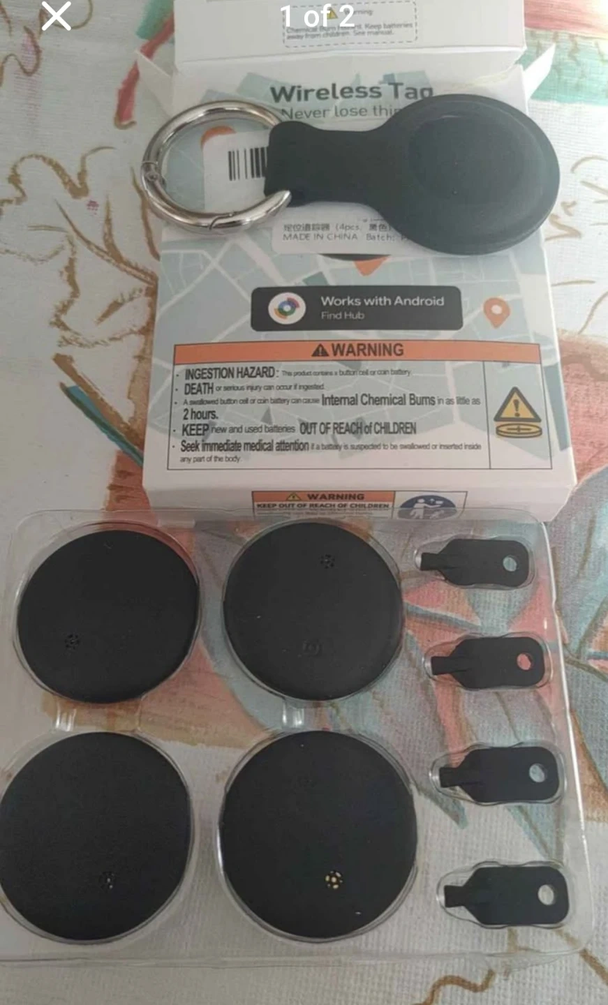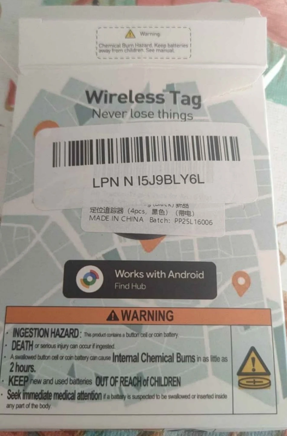 Never lose your things with this wireless tag tracker. It works with Android Find Hub. Includes 4 tags and 4 accessories for attachment. Keep new and used batteries out of reach of children.