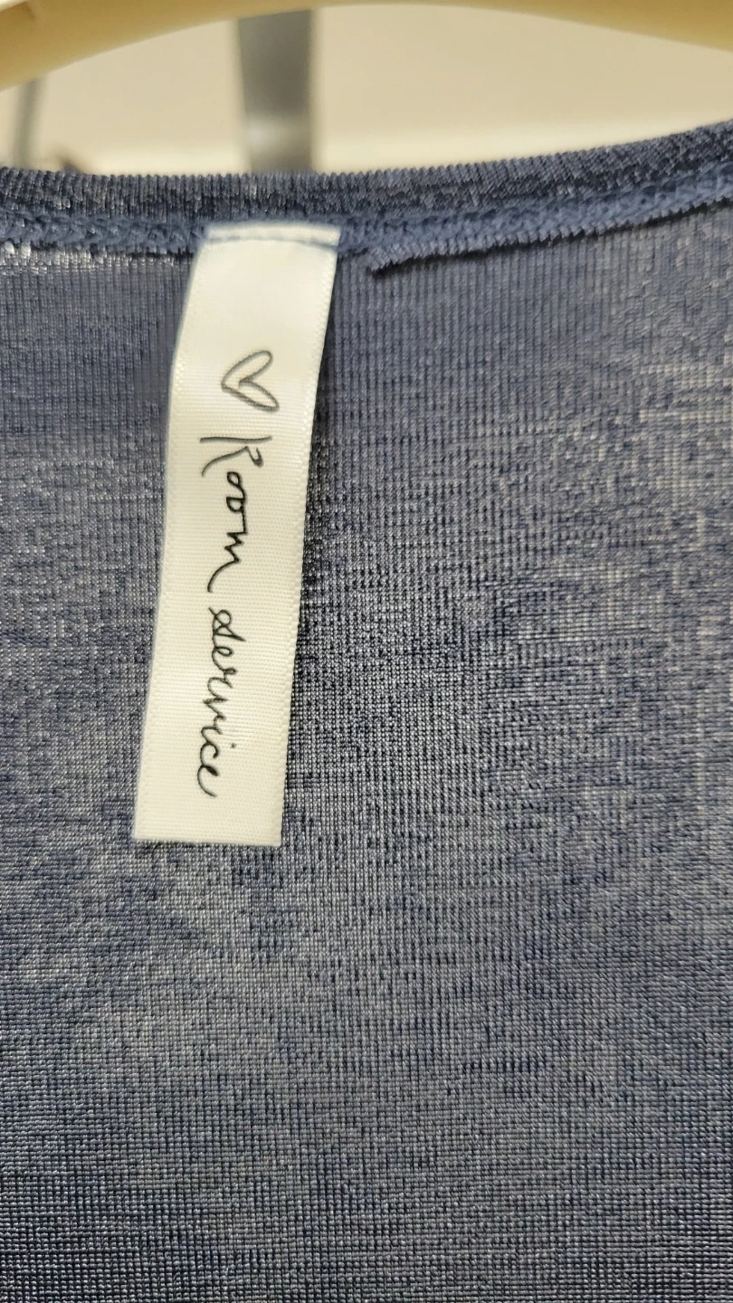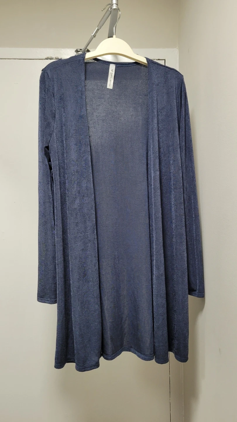 This is a "Room Service" blue open front cardigan. It's made of a soft, shimmering fabric. It has a long sleeve design and a mid-length cut.