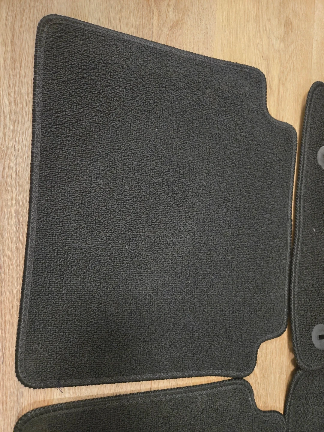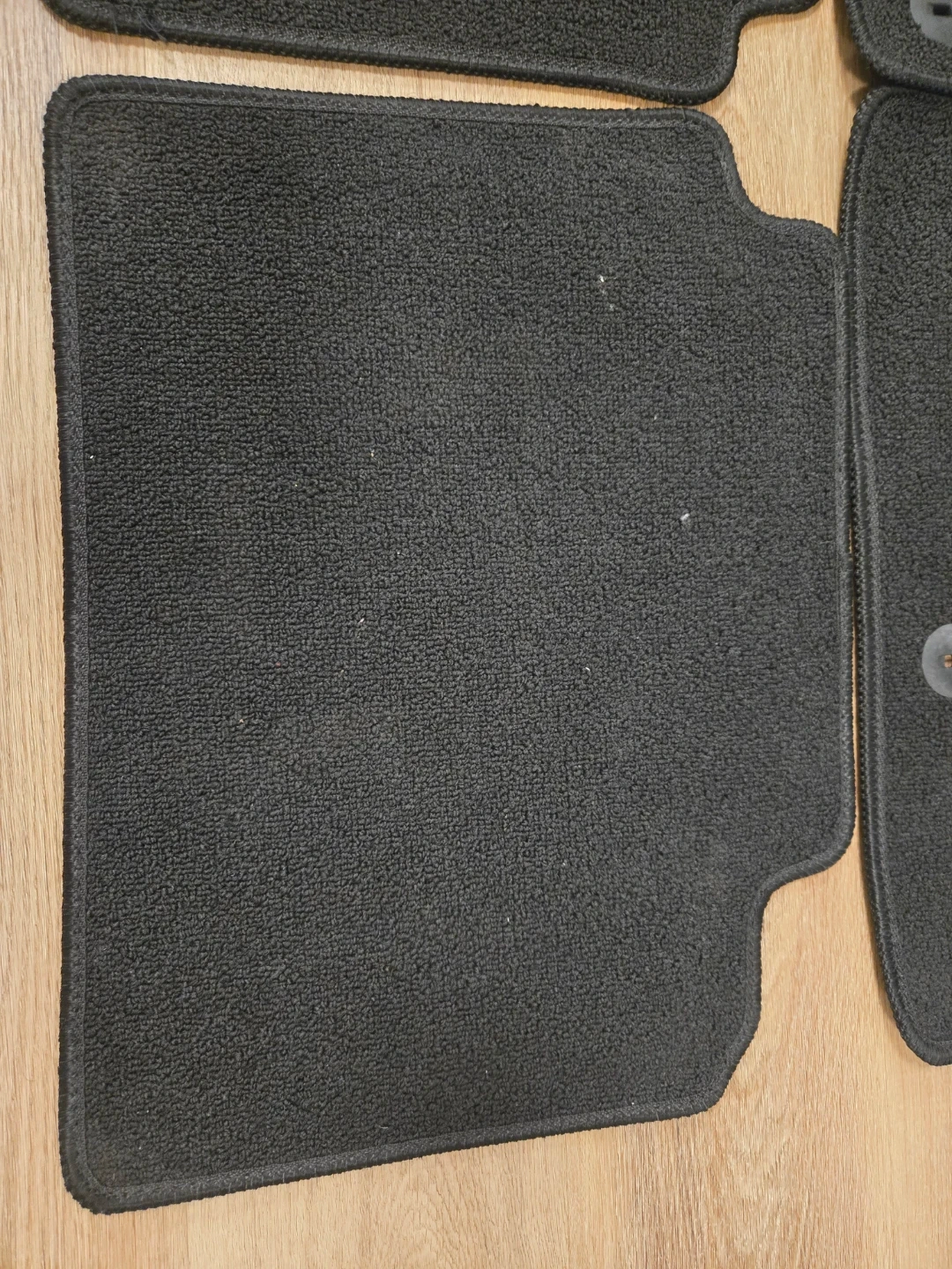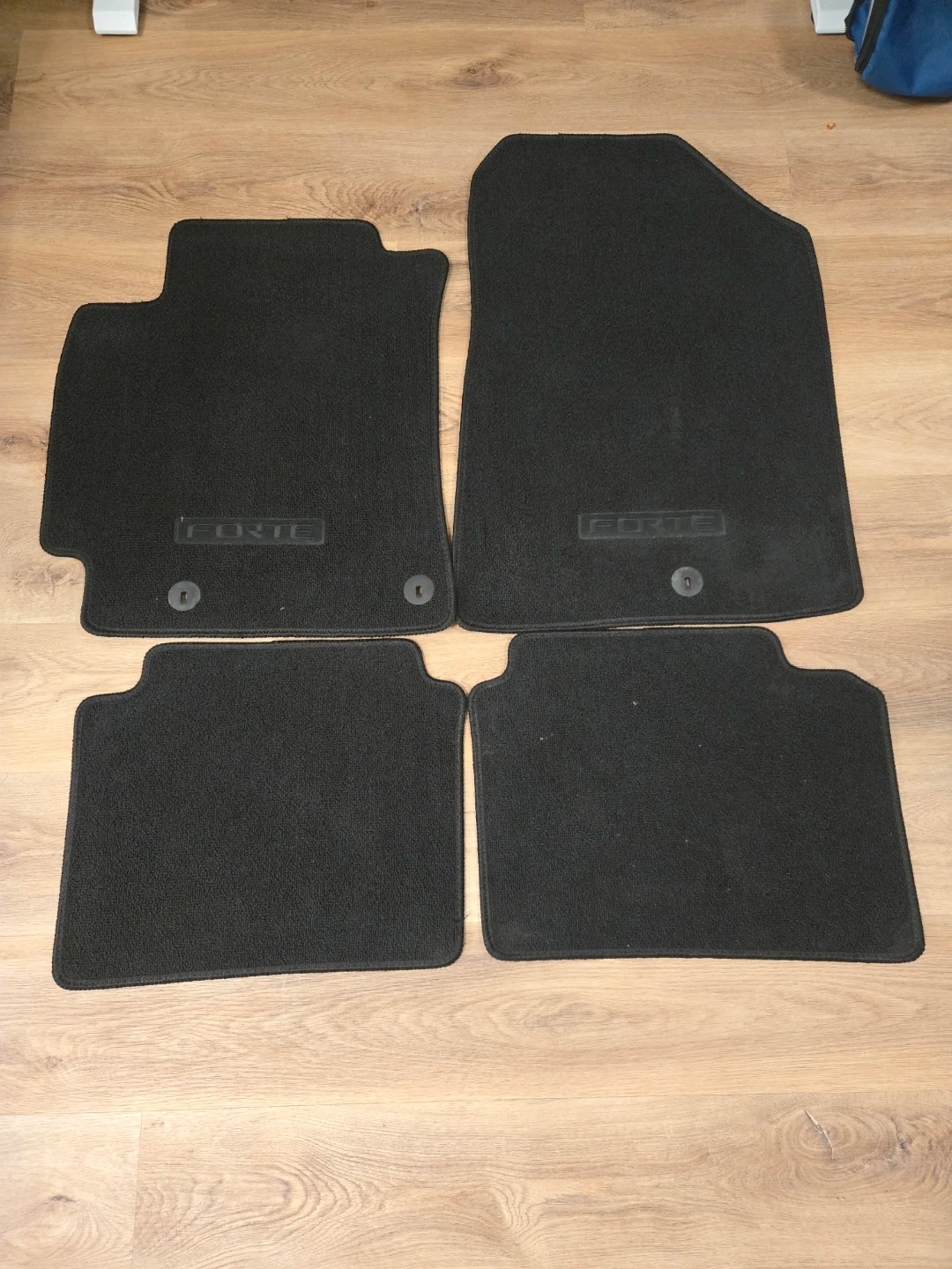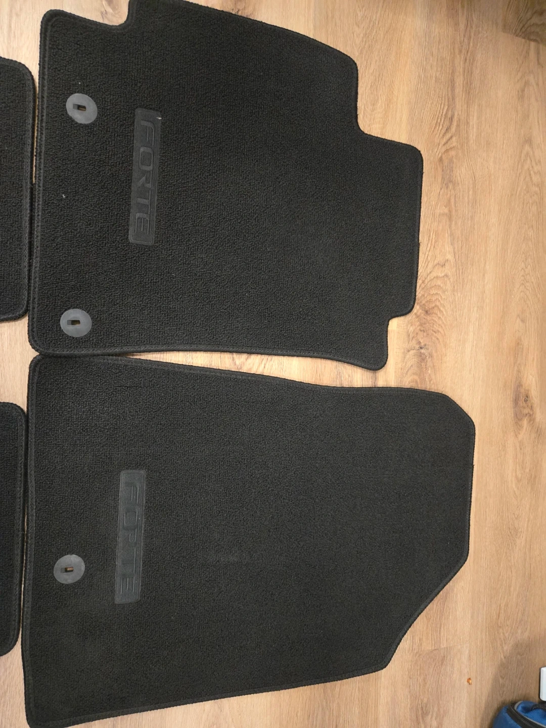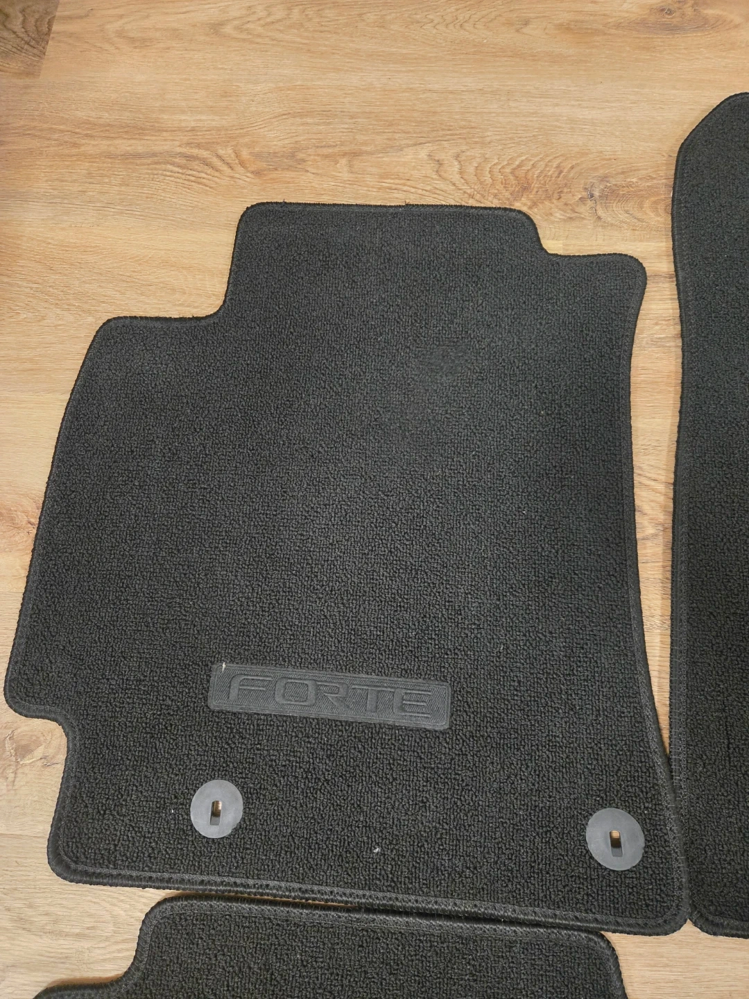 This is a set of four black floor mats for a Forte vehicle. They're made of durable carpet material and include the clips for secure installation. These mats will help protect your car's original flooring from dirt and wear.
