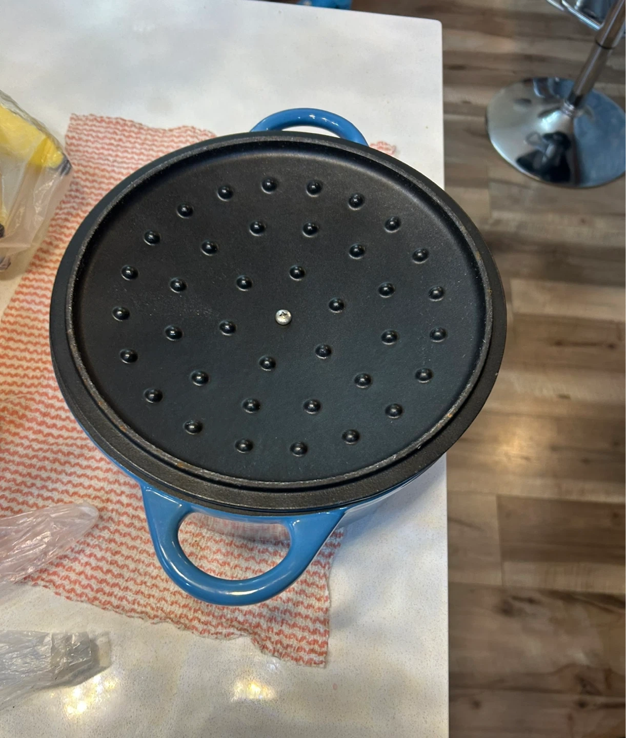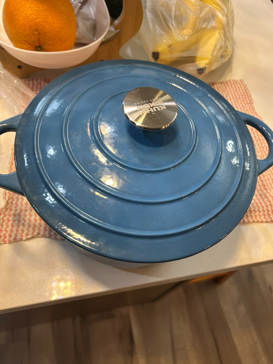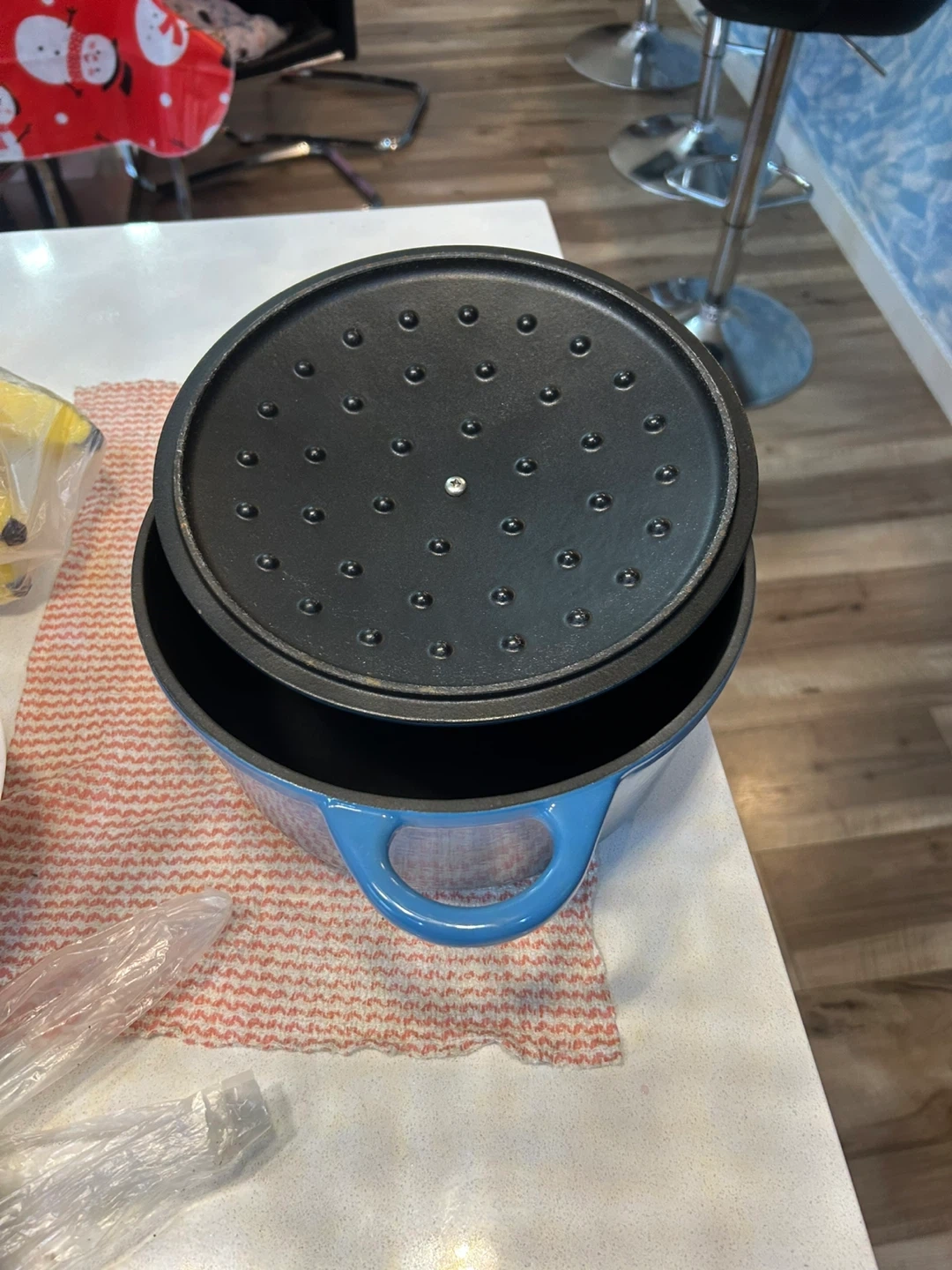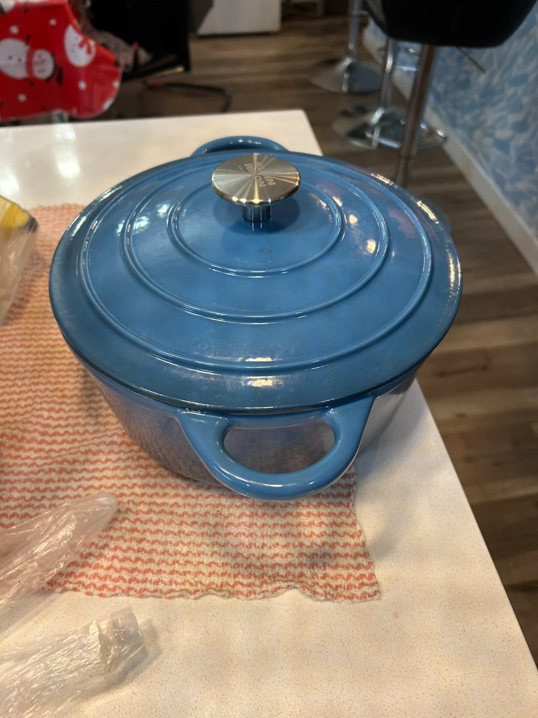 Kurogama 5.5-quart enamel cast iron Dutch oven in a lovely blue colour. It's great for stews, roasts, and baking bread. This pot is perfect for slow cooking and retaining heat.