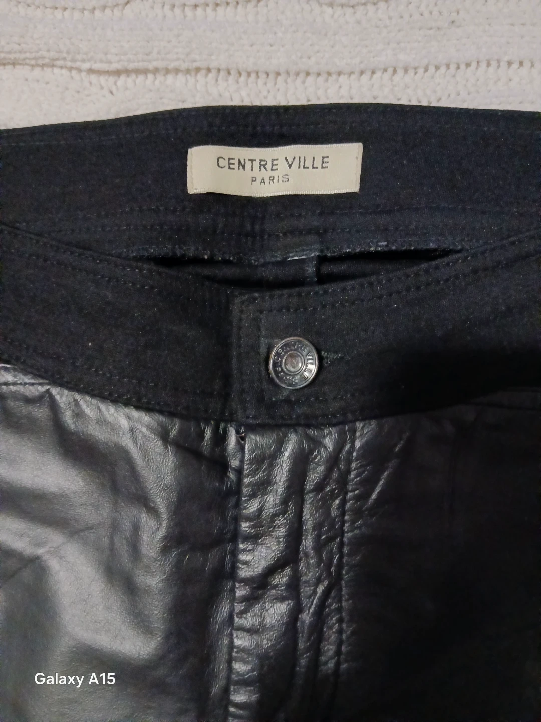 These CENTRE VILLE PARIS pants feature faux leather paneling on the front. They're black and have a classic button and zipper closure. The material appears to be a blend with faux leather accents.