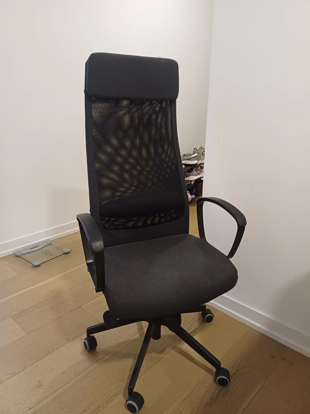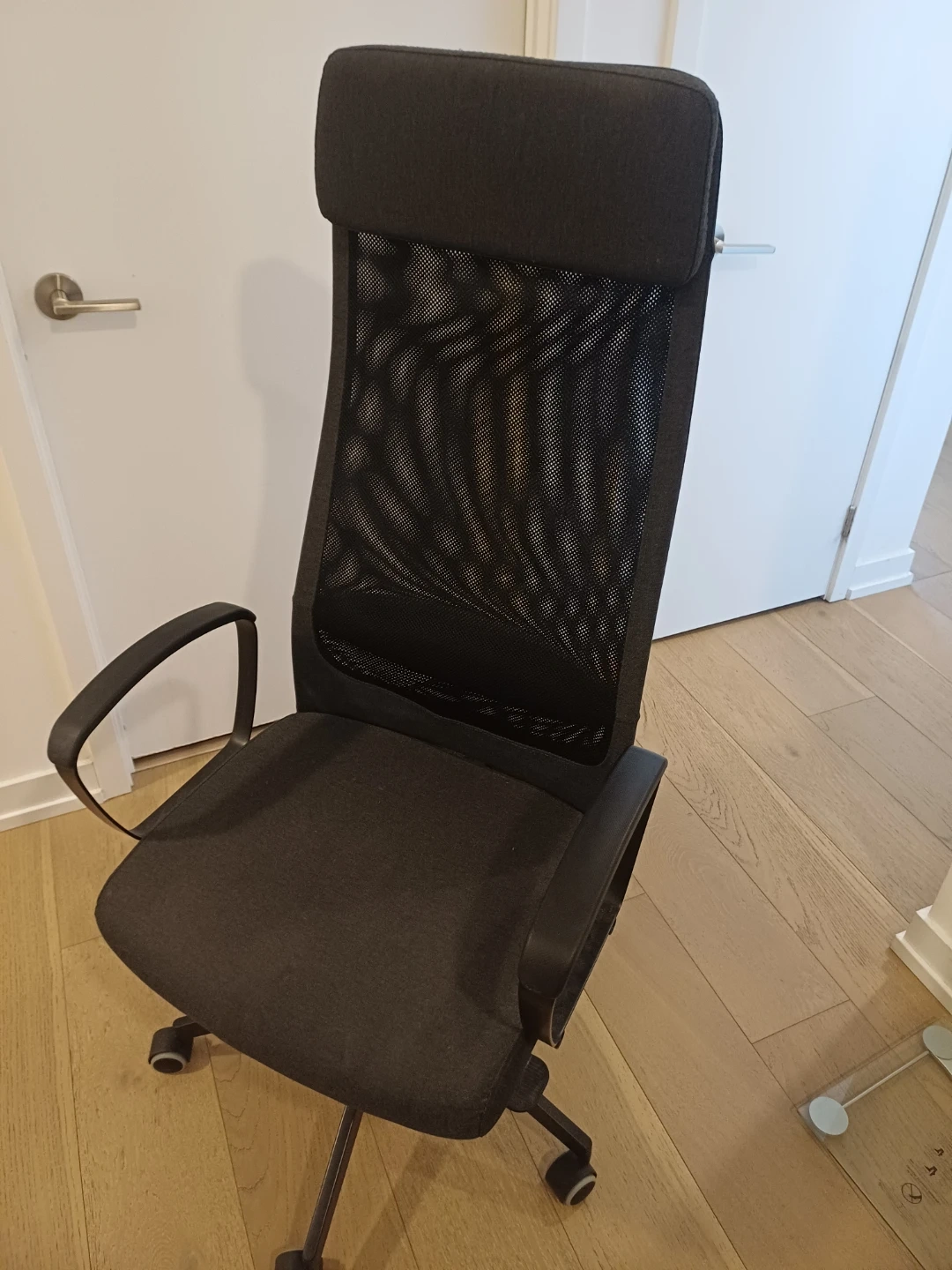 Comfortable black ergonomic office chair with a high mesh back and adjustable headrest. It features padded armrests and a five-wheel base for stability and easy movement. Perfect for long work sessions at home or in the office!
