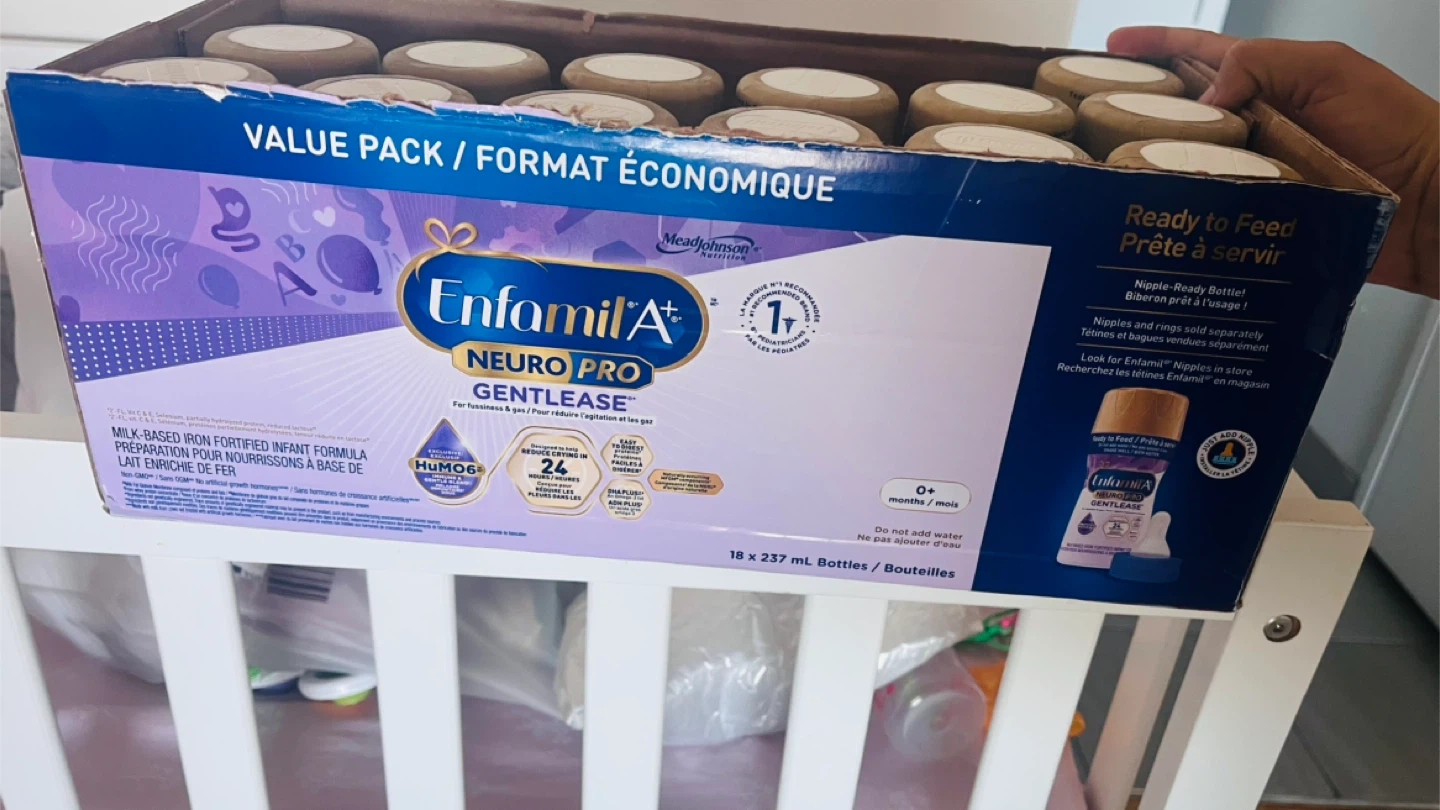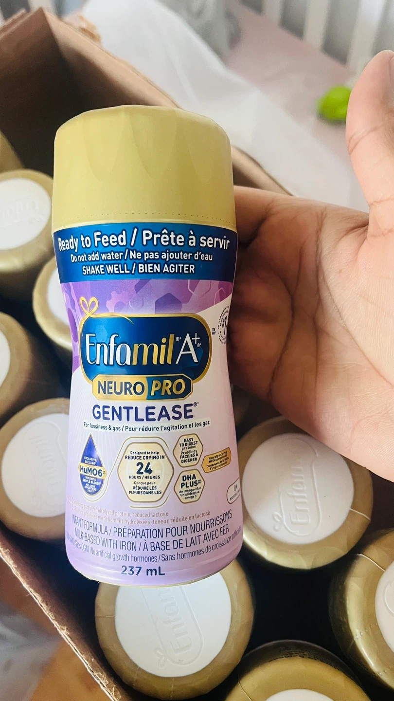 Enfamil A+ Neuro Pro Gentlease formula comes in ready-to-feed 237mL bottles. It's designed to reduce fussiness and gas. Includes DHA Plus for brain development.