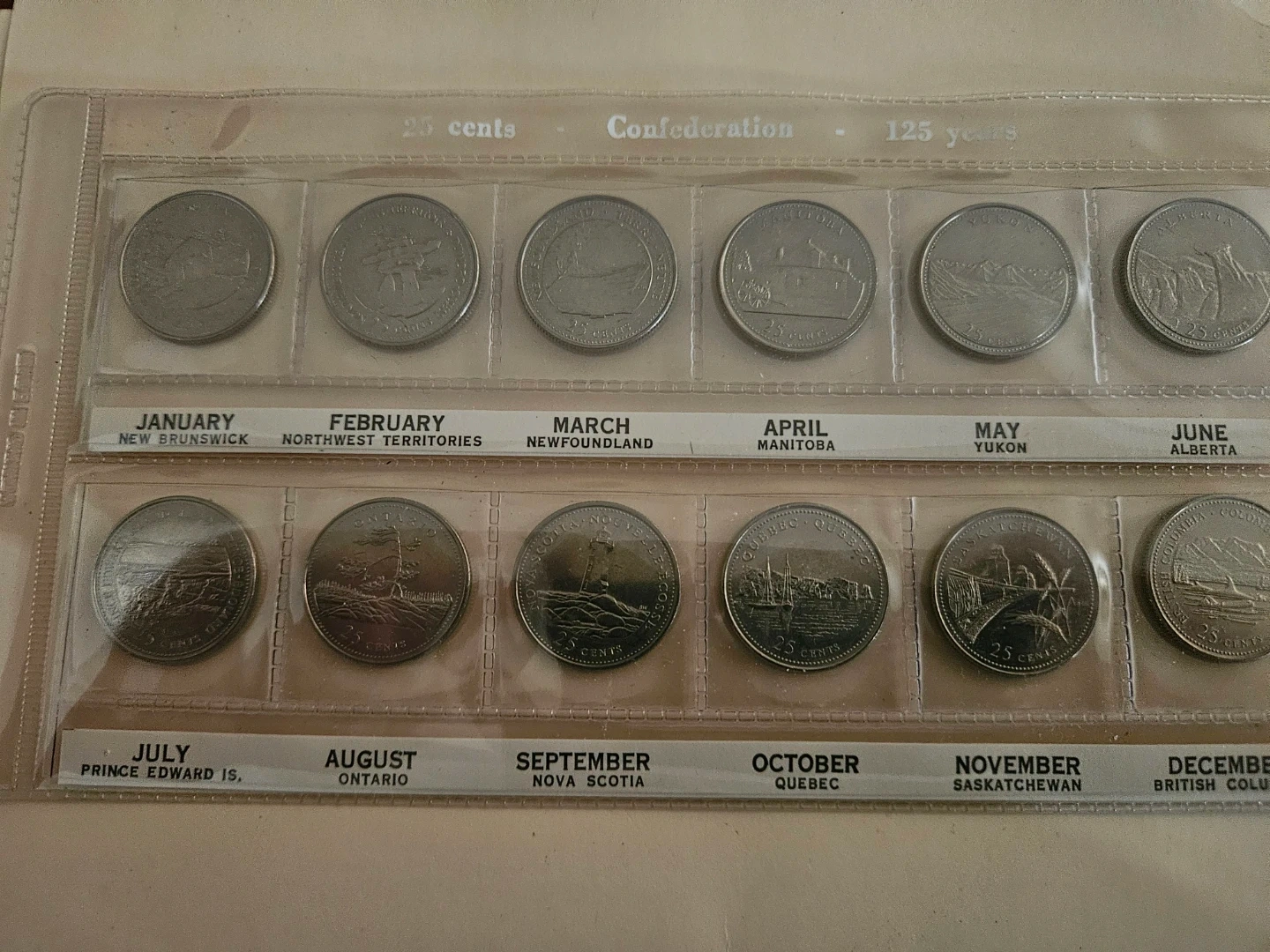 This is a collection of Canadian 25-cent coins representing each province and territory. It commemorates the 125 years of Confederation. Each coin features unique provincial or territorial imagery on one side and the effigy of Queen Elizabeth II on the other.