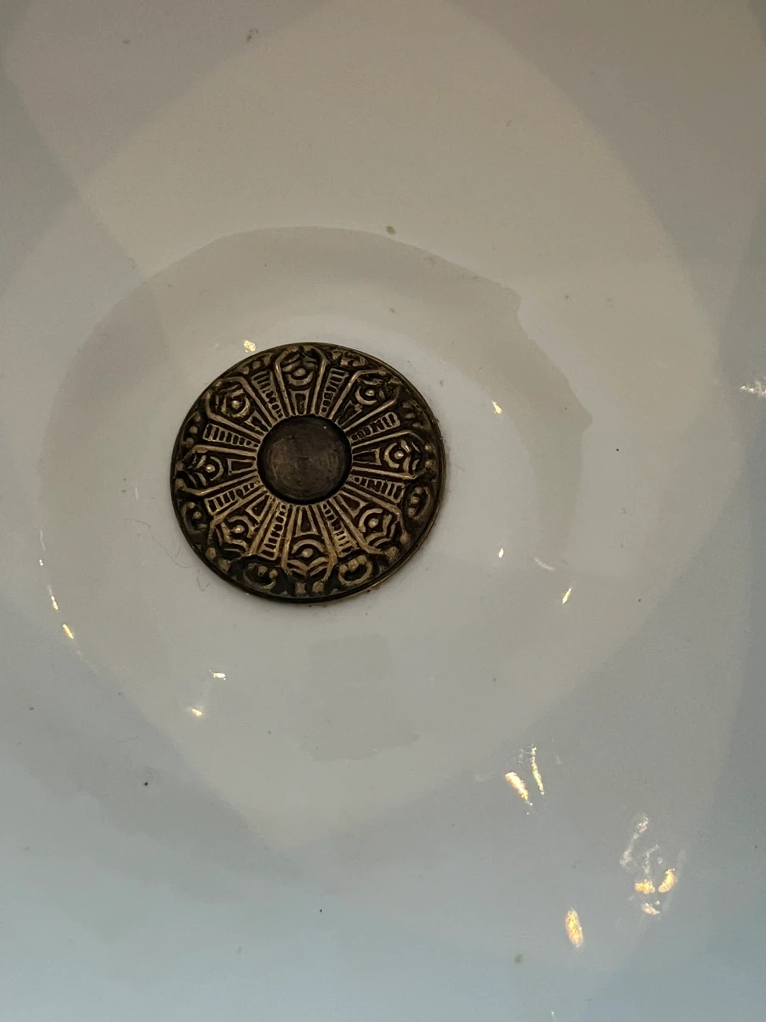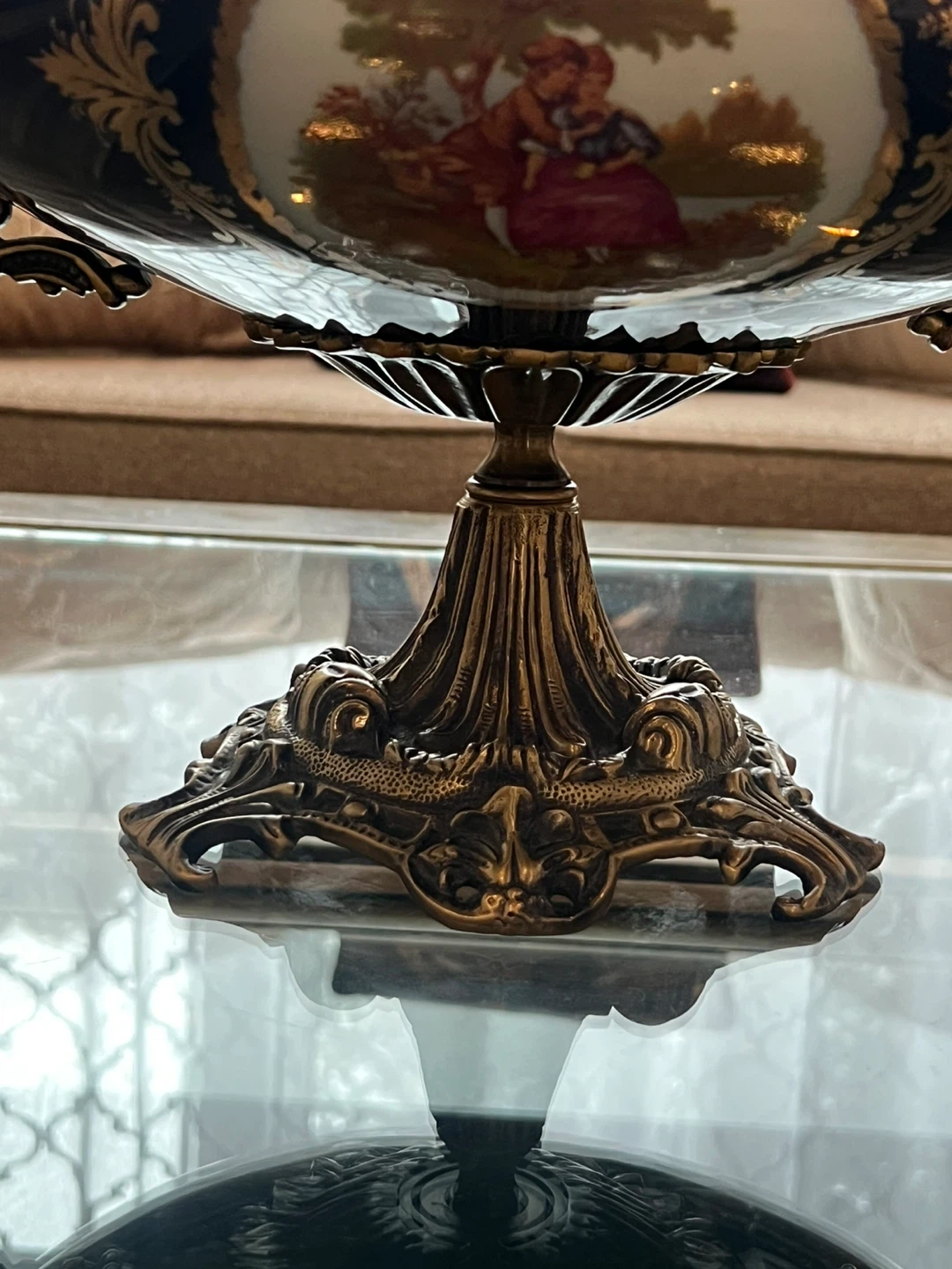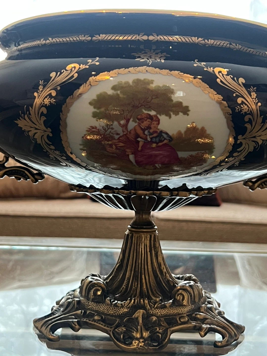 A dark blue ceramic pedestal bowl featuring ornate gold trim and a scenic painting. It has decorative metal handles and a detailed bronze-toned base. Perfect for display or as a statement piece on a table.