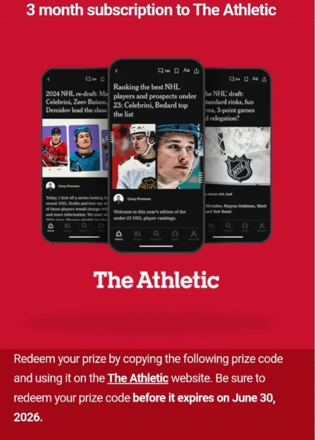 a 3 month subscription to The Athletic! Redeem your prize code before it expires on June 30, 2026. This subscription offers access to NHL news and player rankings. Message for code I don't use this.