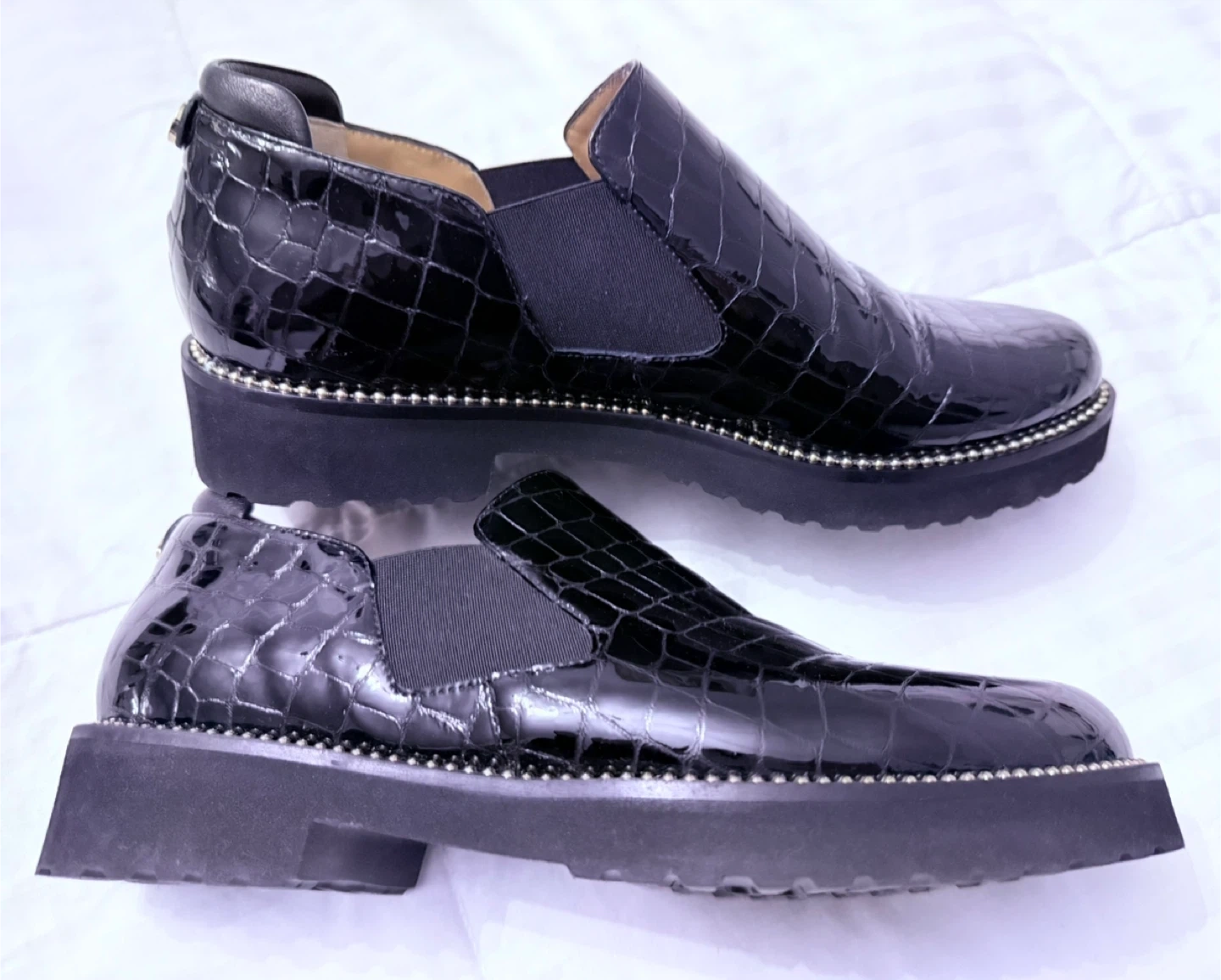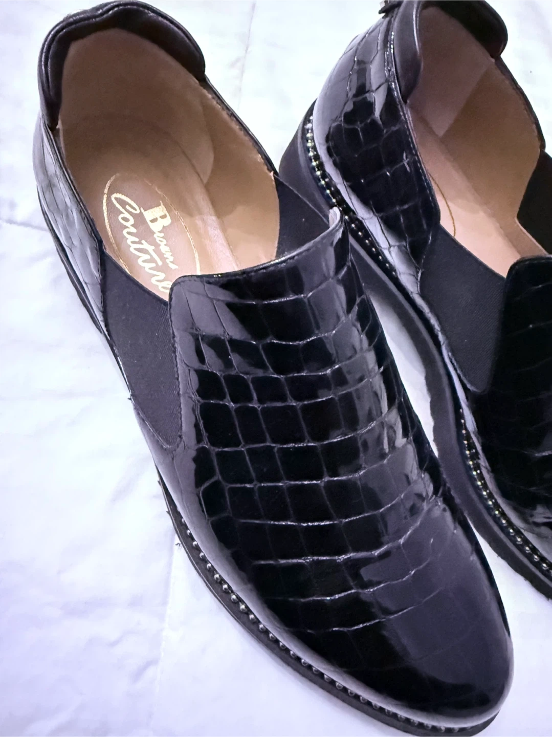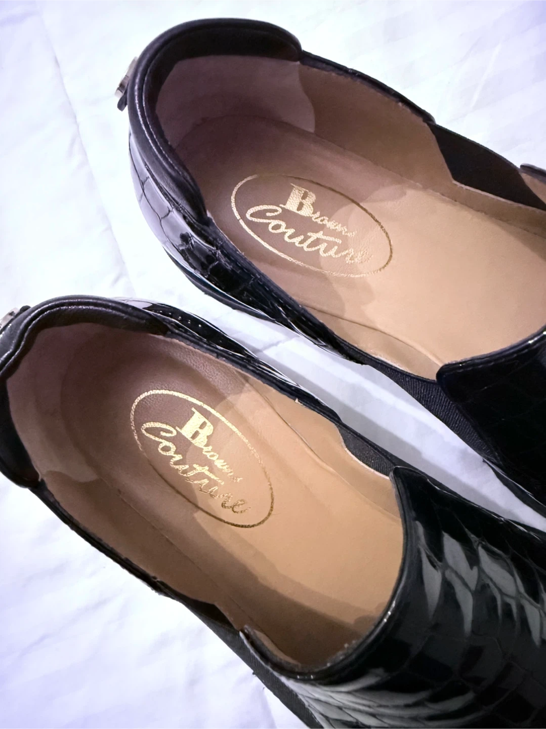 Stylish black leather slip-on shoes from Browns Couture! These shoes feature a unique crocodile-like texture and a comfortable design. Perfect for adding a touch of elegance to any outfit