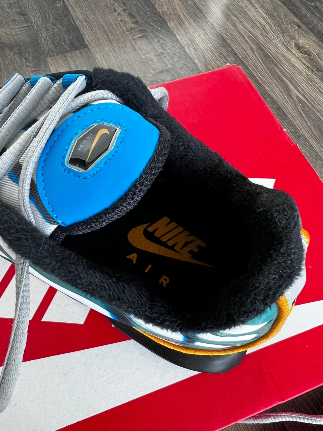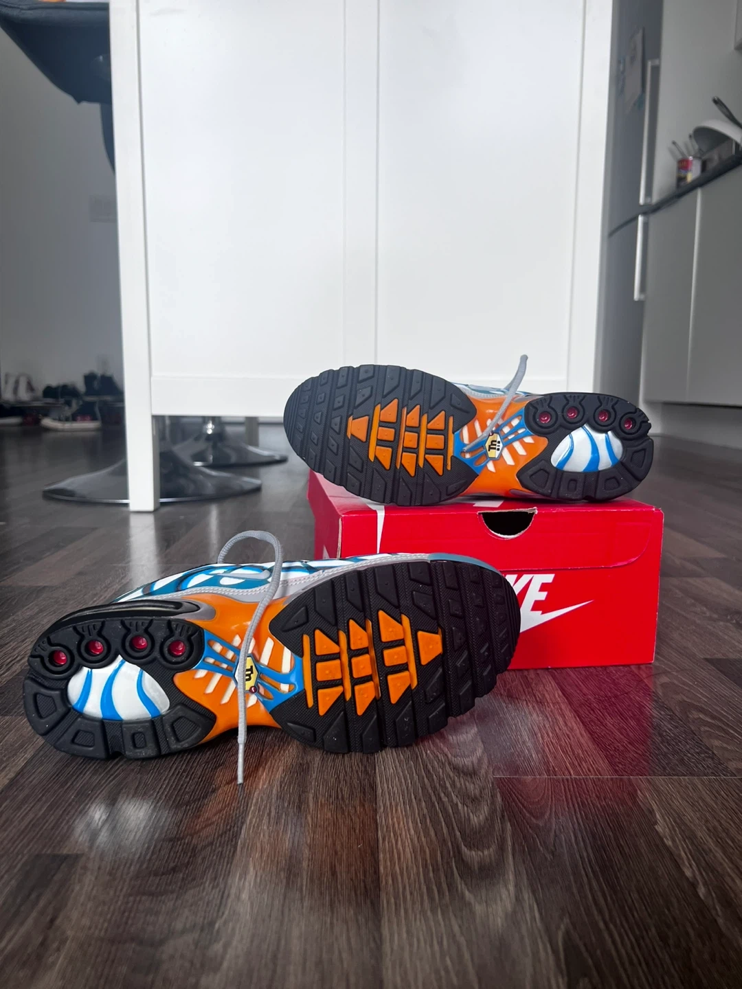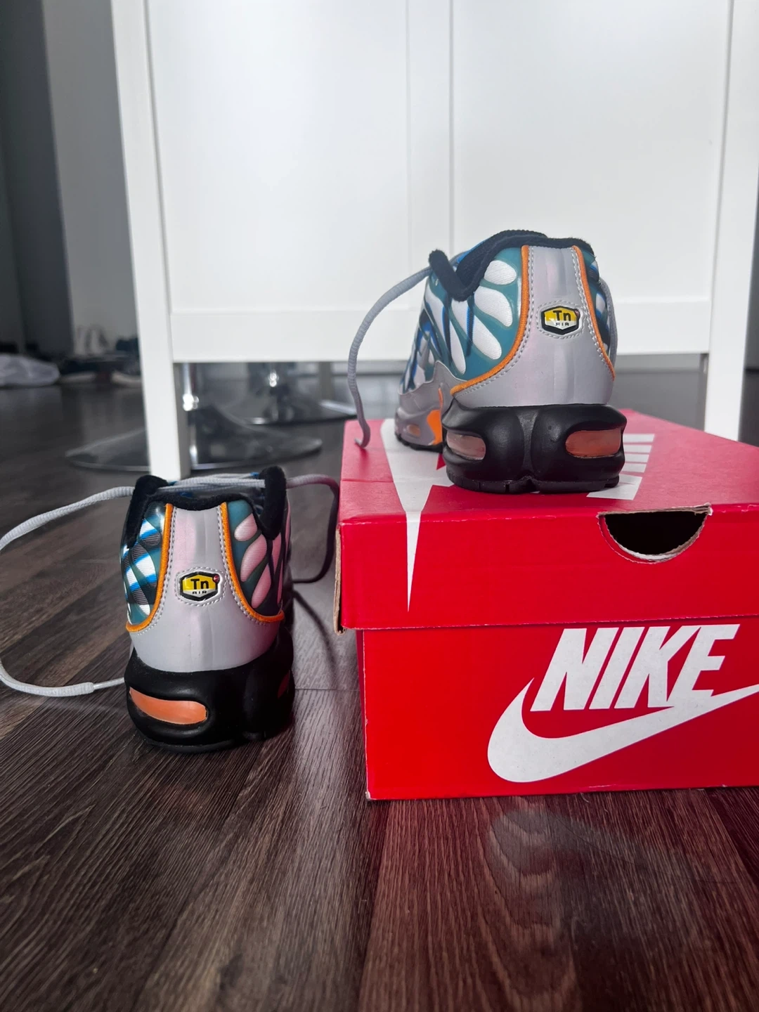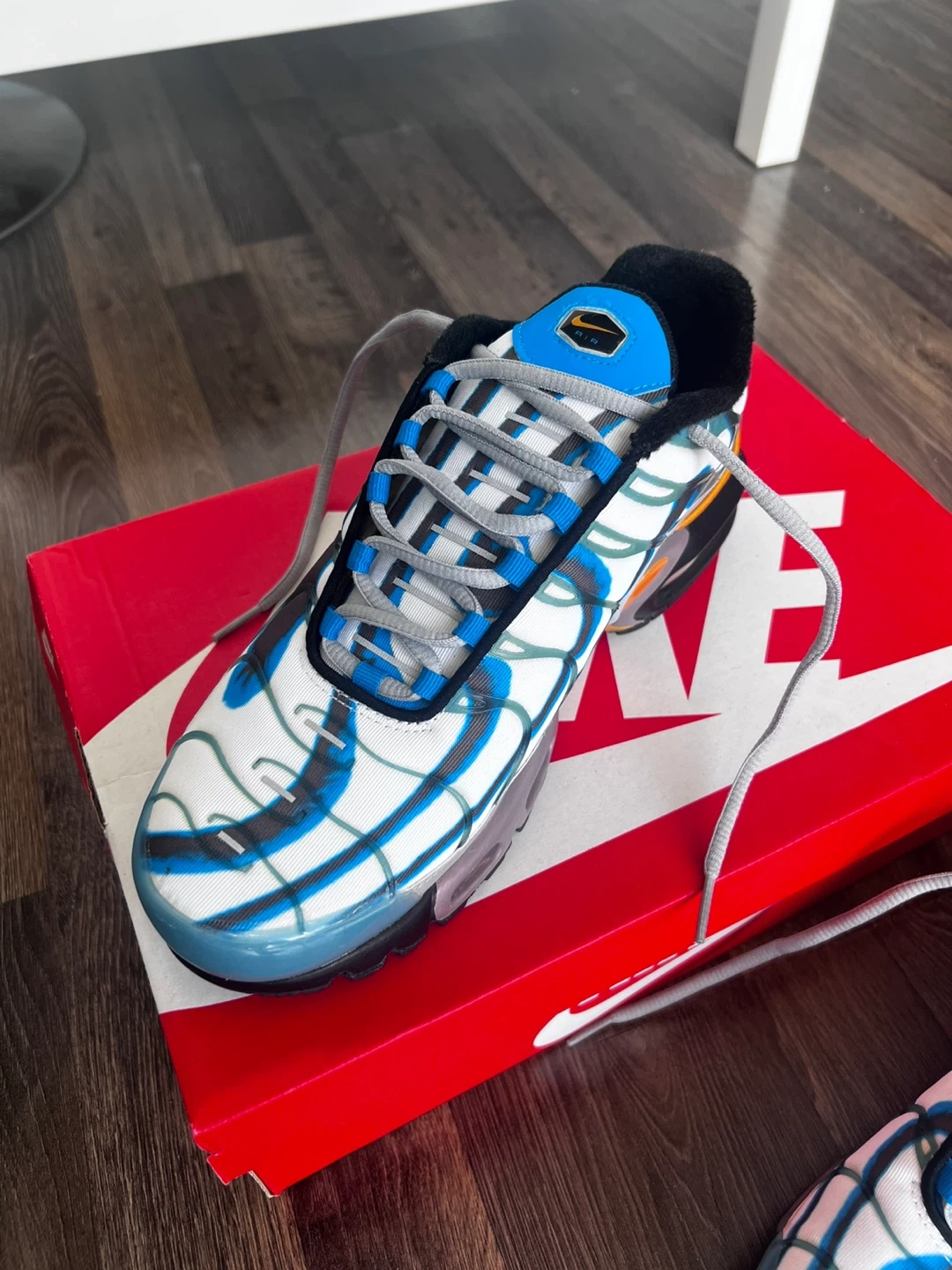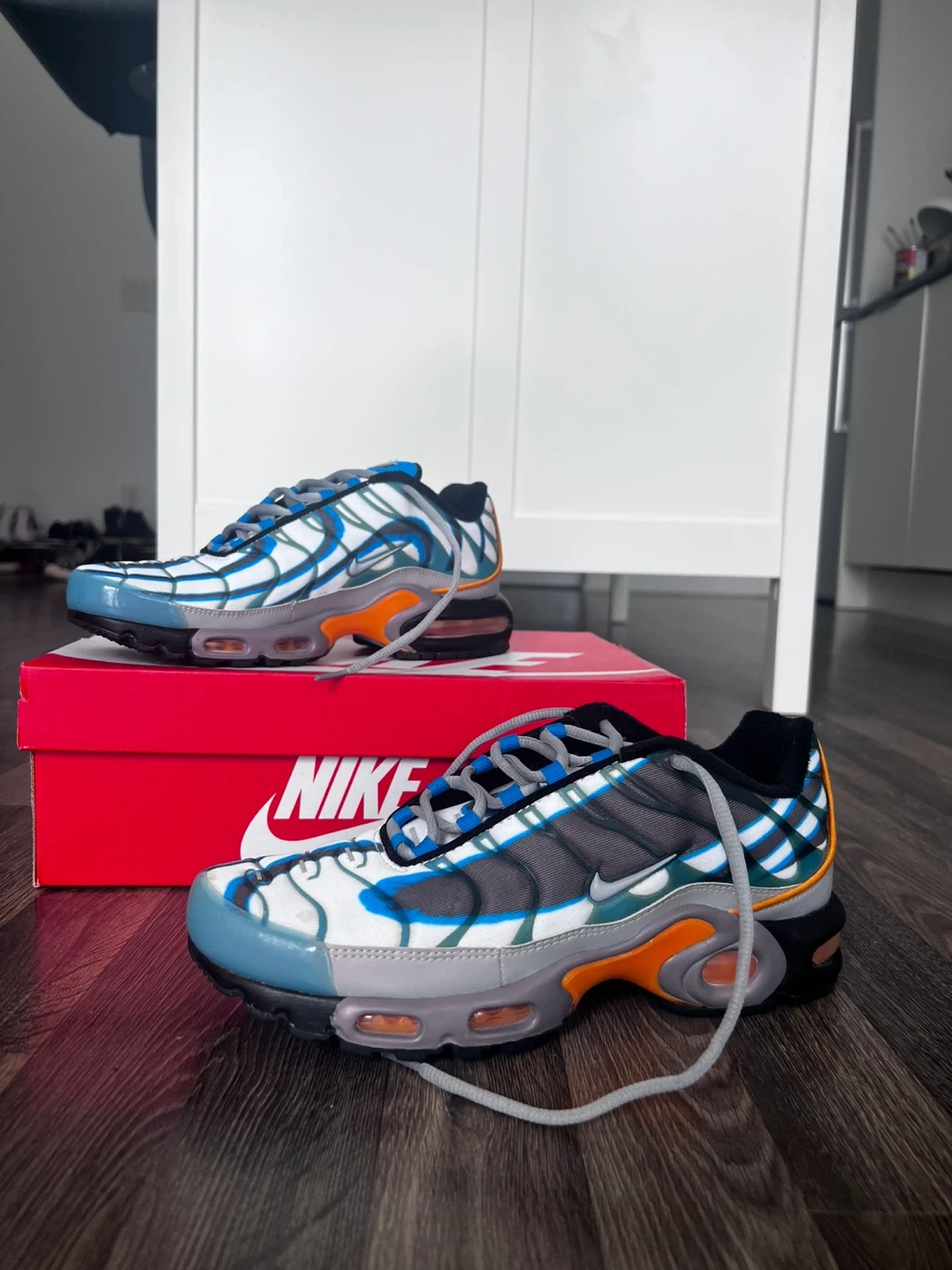 These Nike Air Max Plus TN SE shoes feature a unique white, blue, and grey colourway with orange accents. They include the signature Air Max cushioning and a durable rubber sole. The original box is also included!