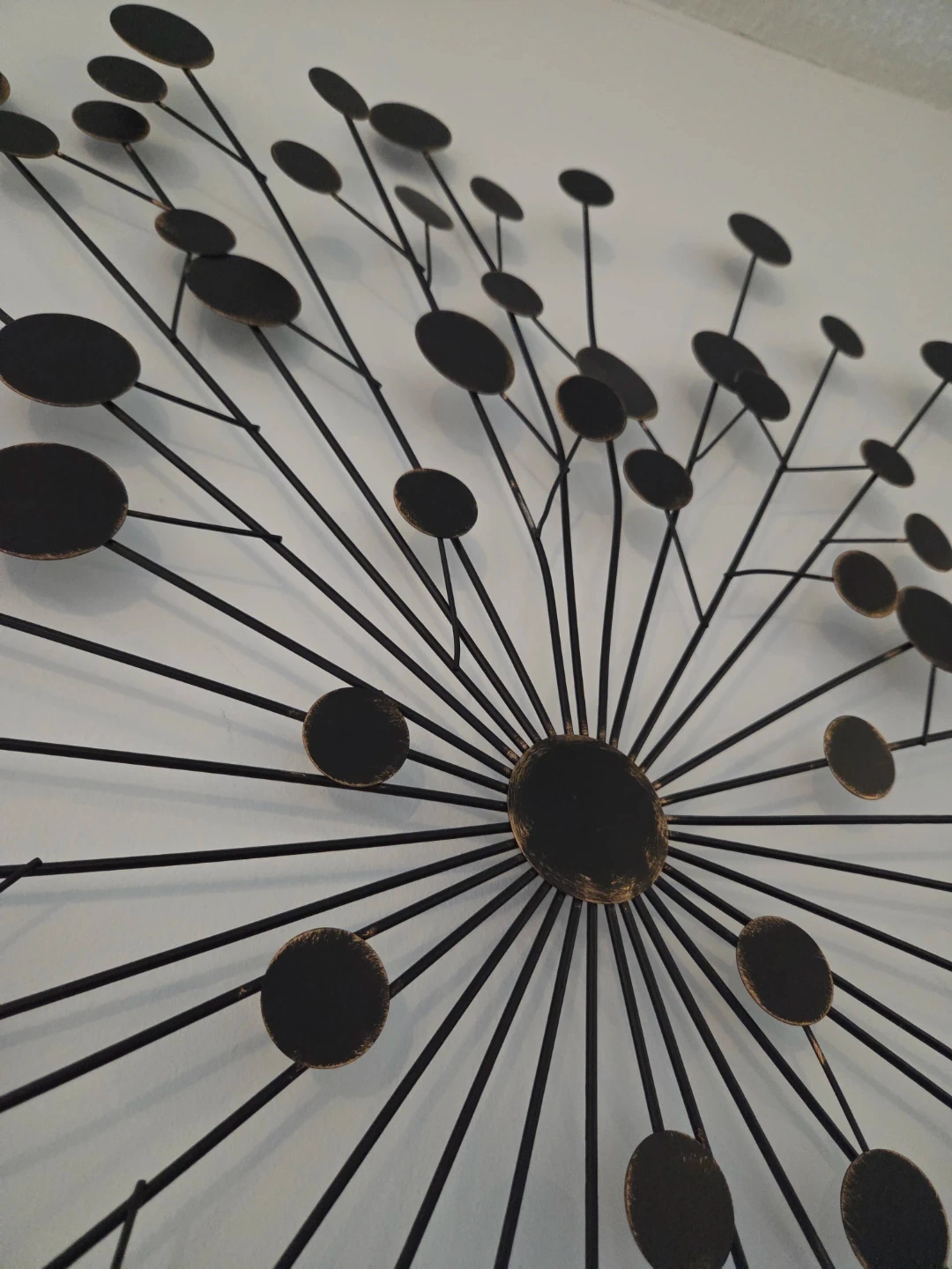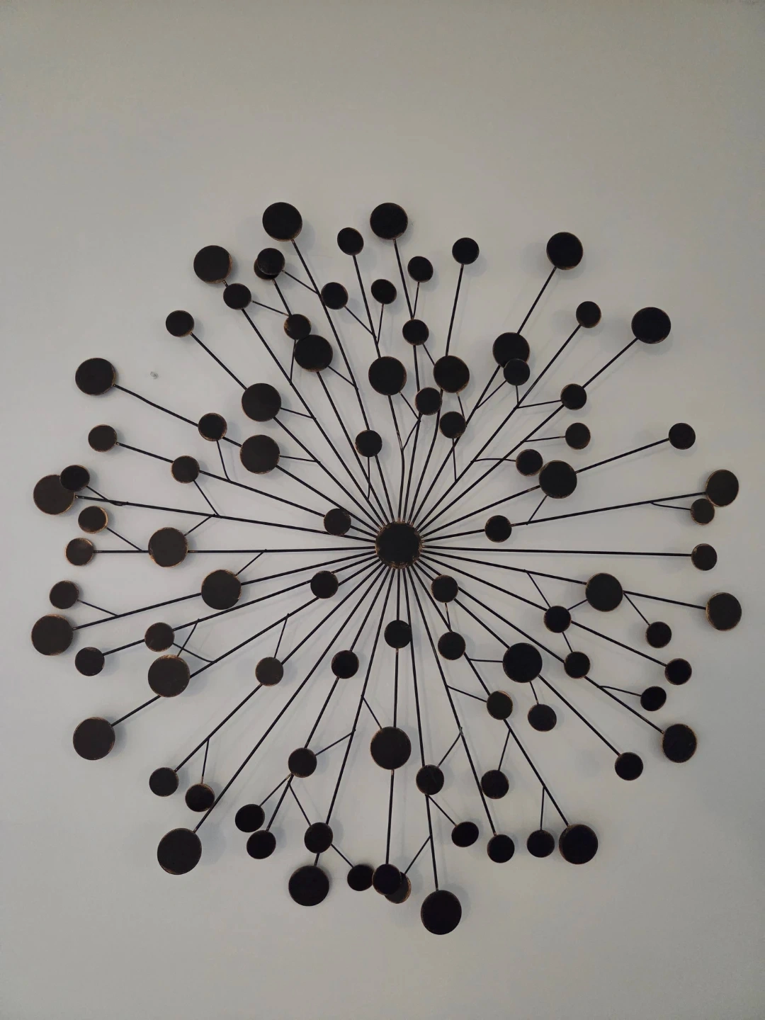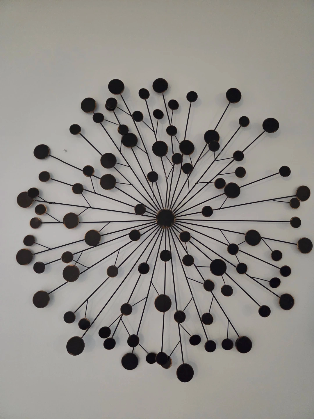This striking metal wall art piece features a black dandelion-inspired design. It's made of durable metal, perfect for adding a touch of modern flair to any room. Its unique silhouette creates a dynamic focal point!