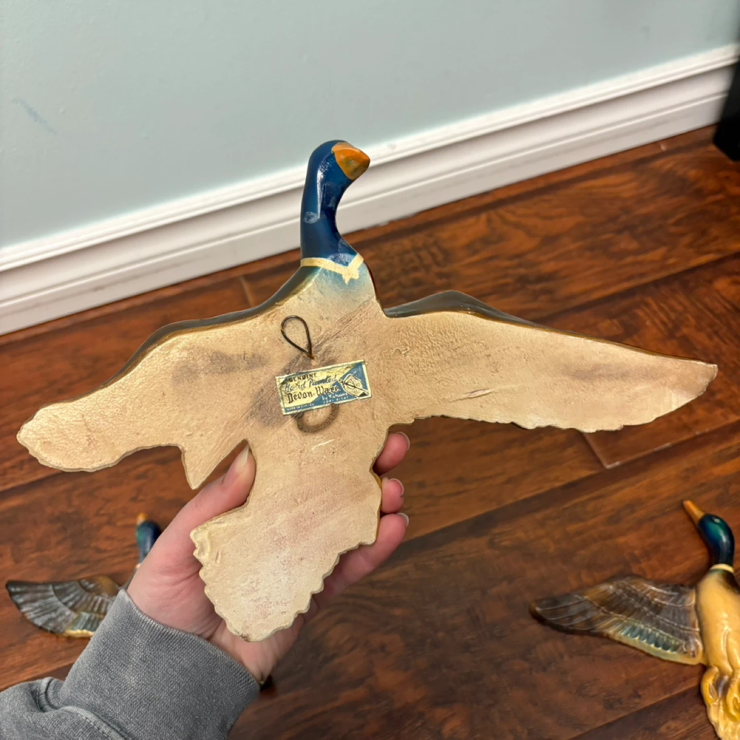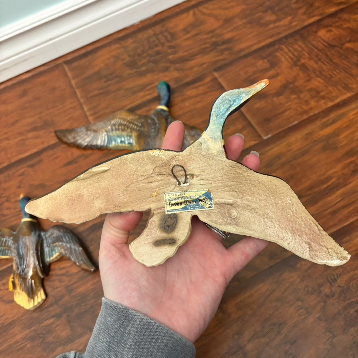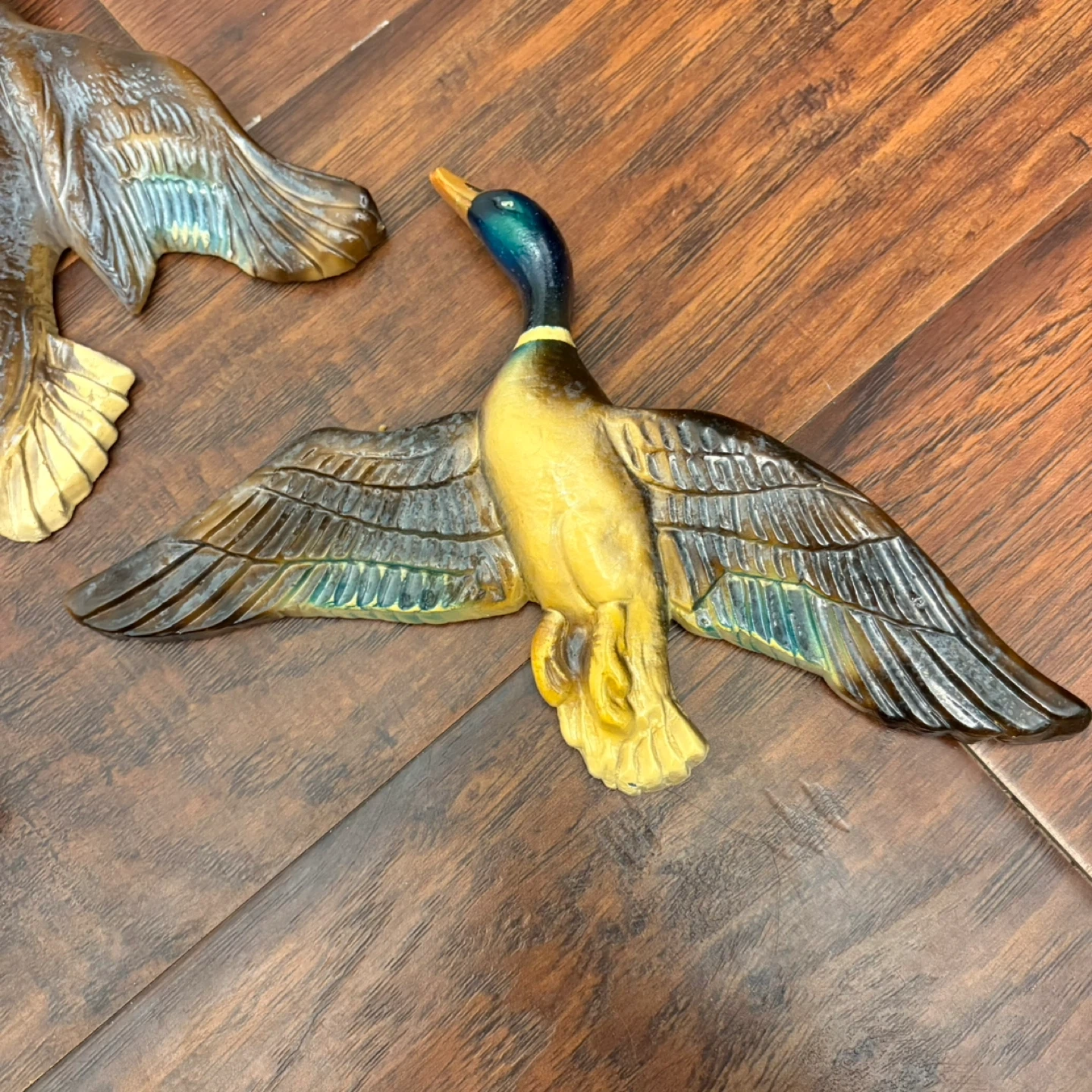 These are hand-painted wall plaques of mallard ducks in flight. Each piece is made of ceramic and is designed to be mounted on a wall. They're a lovely addition for any wildlife enthusiast's home.