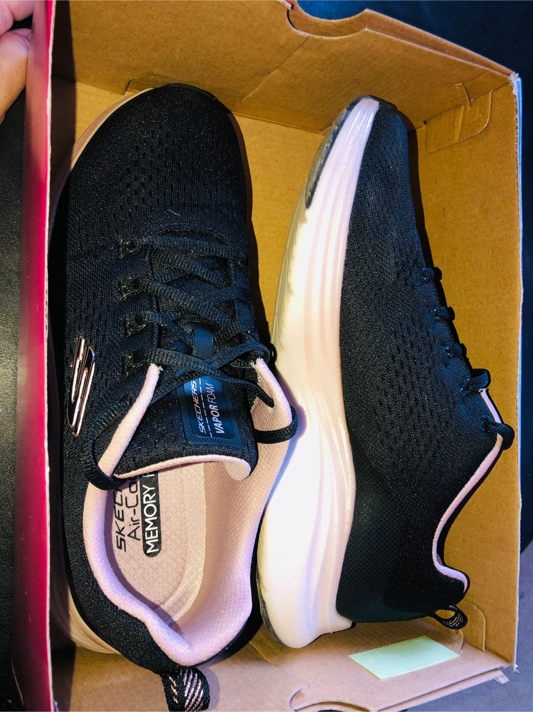 ✨🌟Only $35!!!⭐️🎉These Skechers trainers feature a black breathable mesh textile, with a pink trim and Vapor Foam sole.