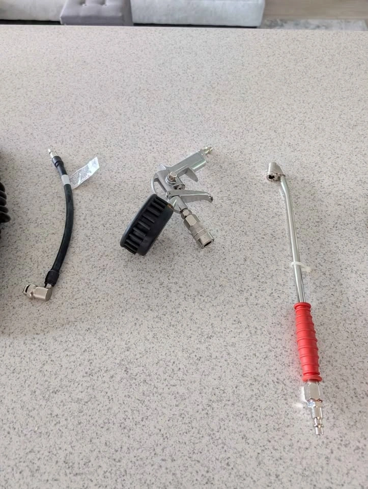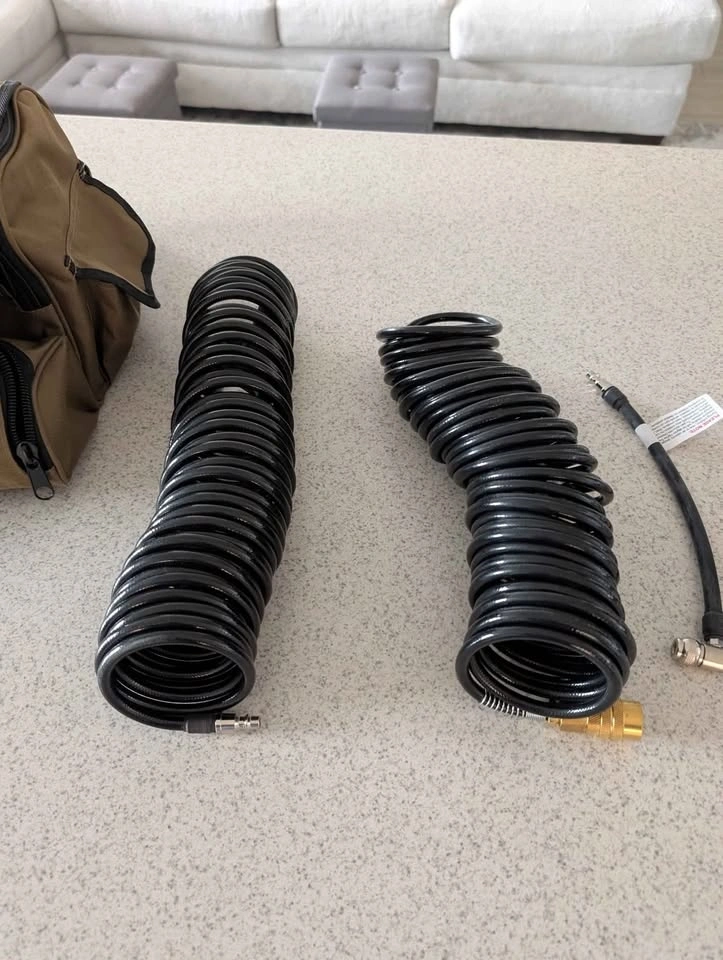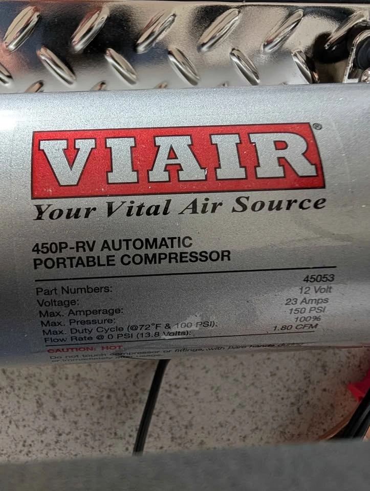 Reason for selling is I have sold my motorhome. Especially great for class A or C, but really good for an dually vehicle. I used it on a 40 ft class A. You really need this if you are driving anything of any size. This 450P-RV Automatic Portable Air Compressor has a long air chuck to reach inside dually. Comes with 2 air hoses, trigger air valve with gauge, and quick connect for ease of use. Price for new from Amazon is $585 + tx. This one is tax free and tariff free!
