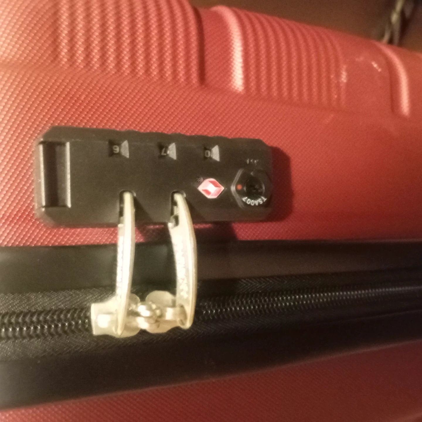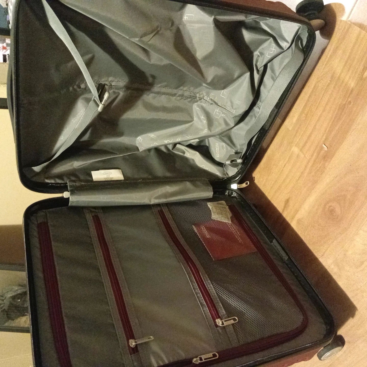 This is a red American Tourister spinner suitcase. It features a TSA-approved combination lock and a durable hardside exterior. The interior has multiple zippered compartments for organization.
