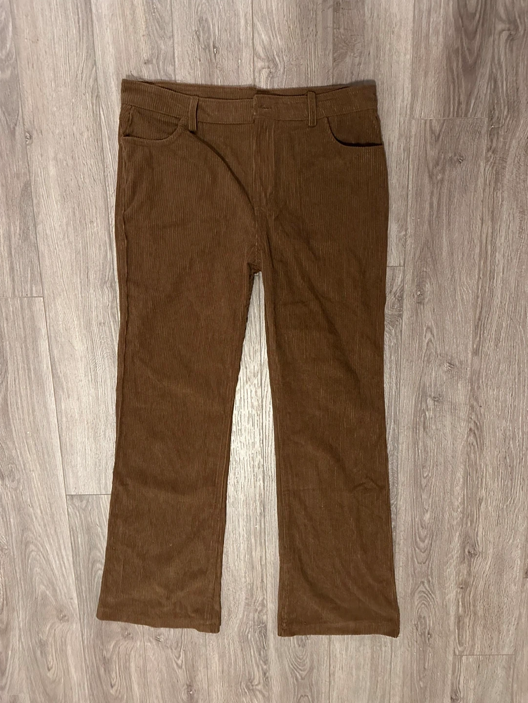 Selling three pants in good condition, brown corduroy pants size L, black cargo pants size 14, and green pants size S. Ready for a new home.