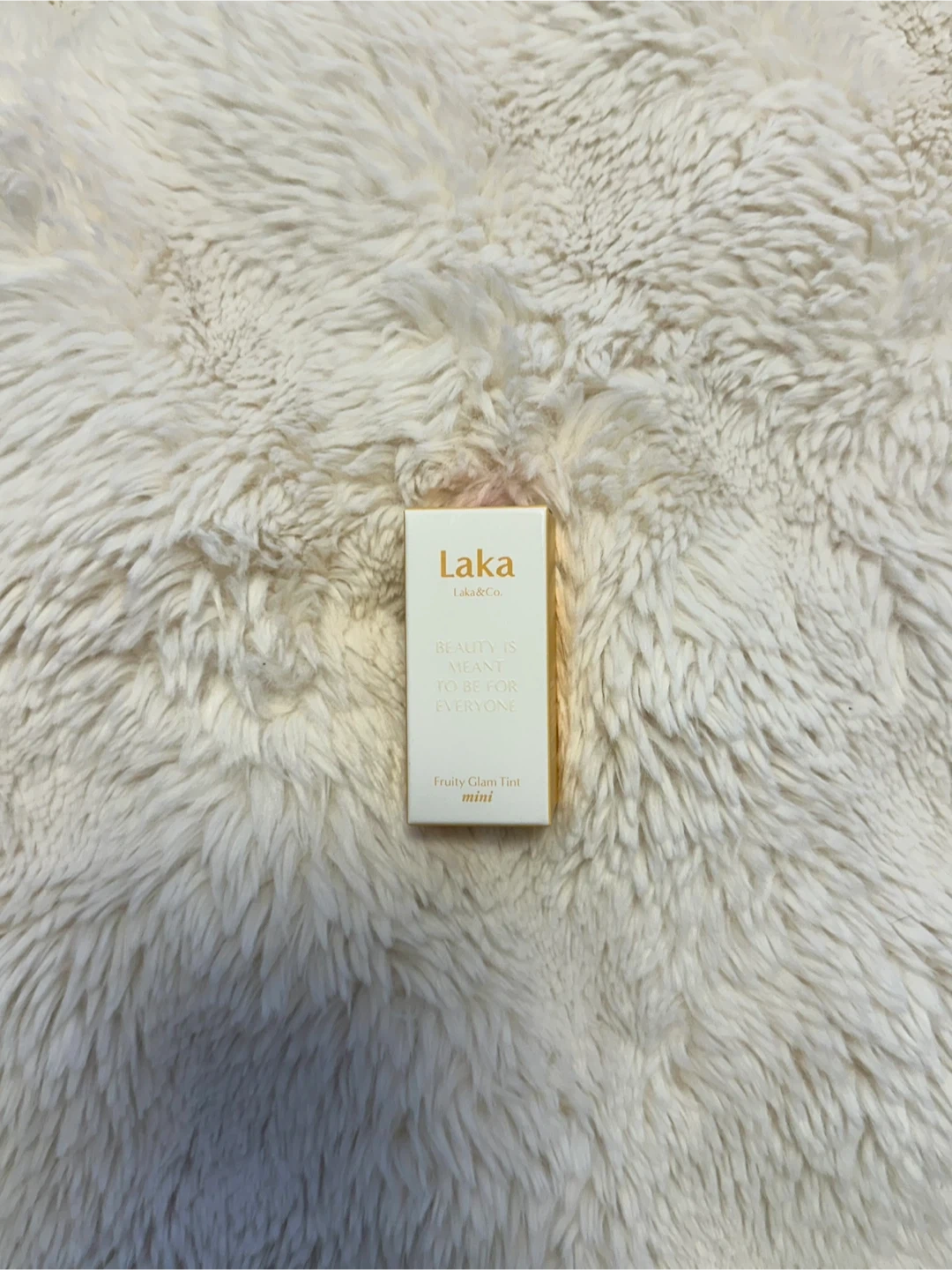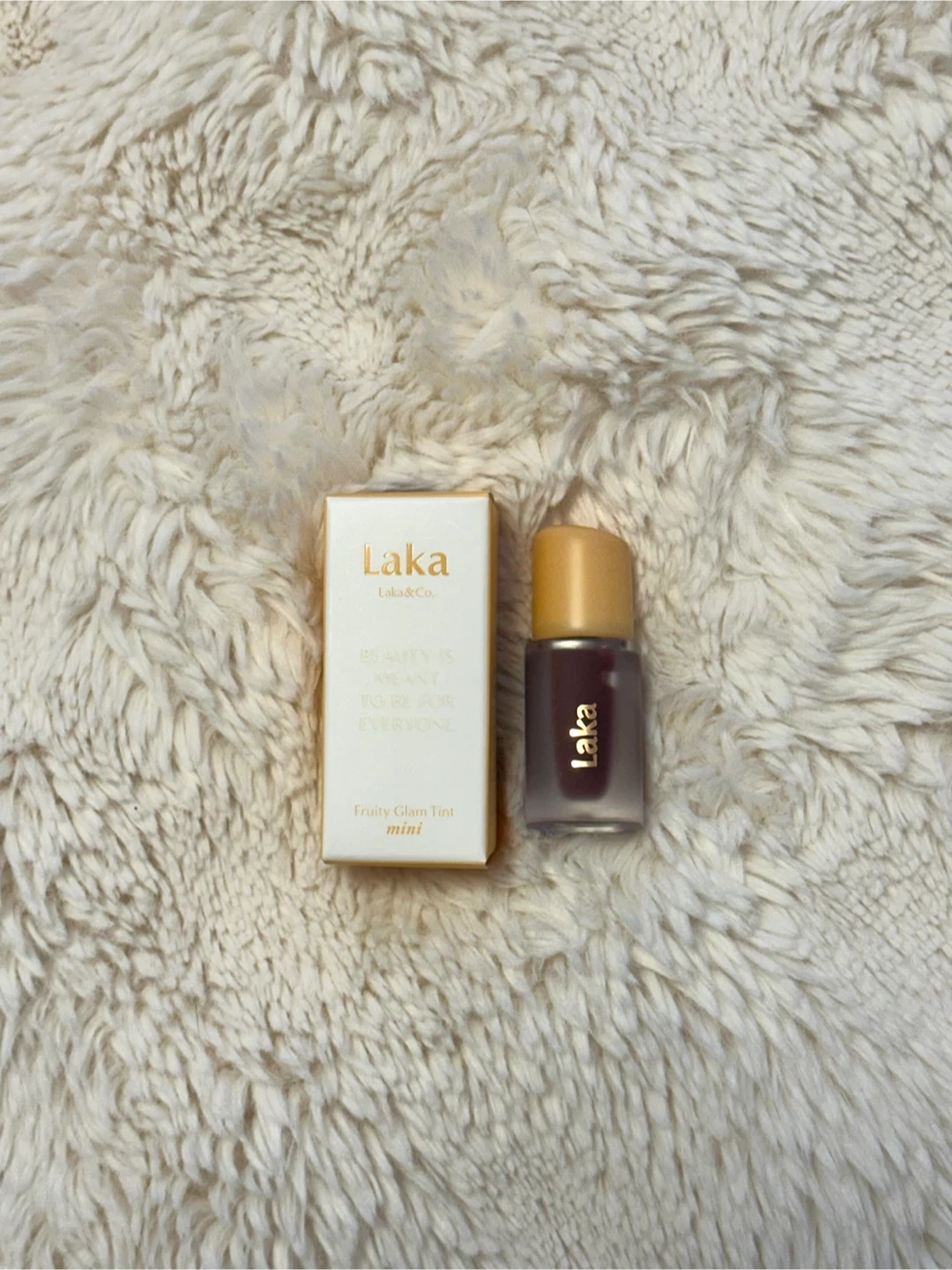 This is a Laka Fruity Glam Tint in a mini size. The shade is Unsweet Berry. It's a lip tint with a dewy finish.