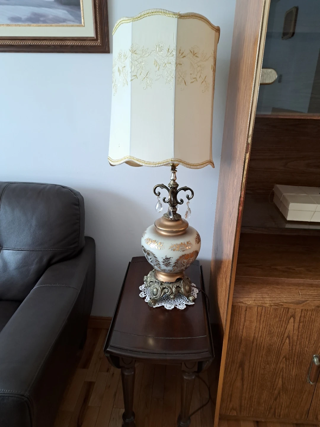 - Lamp body: porcelain/ceramic with glass/crystal accents and metal base/ornament