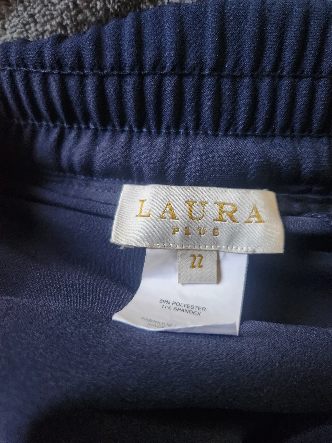 These navy blue pants are from Laura Plus. They're made with 89% polyester and 11% spandex. Size is 22.
