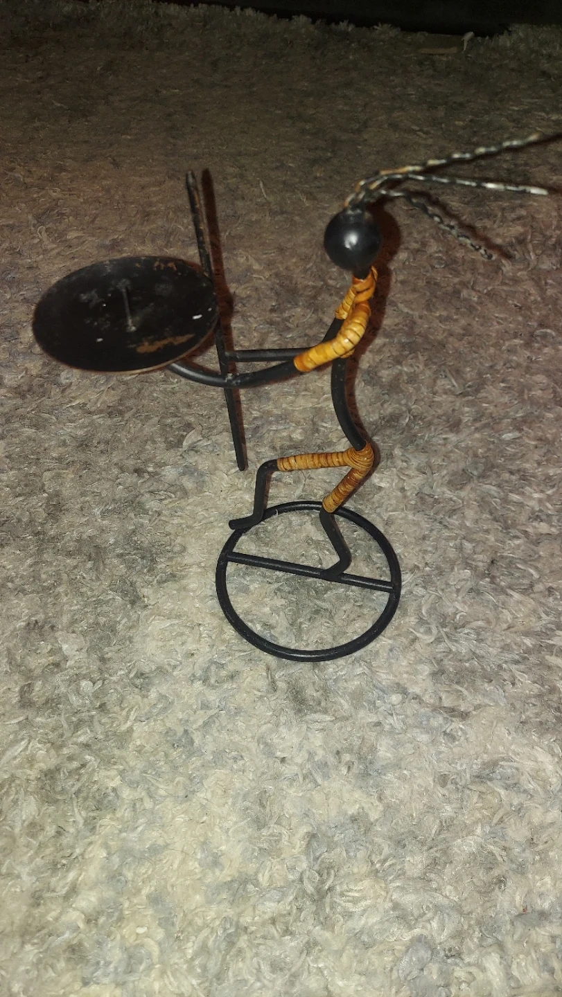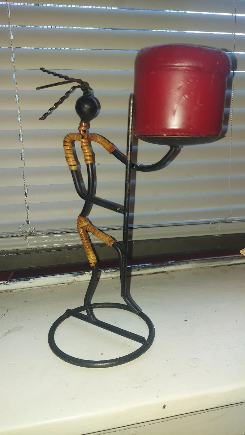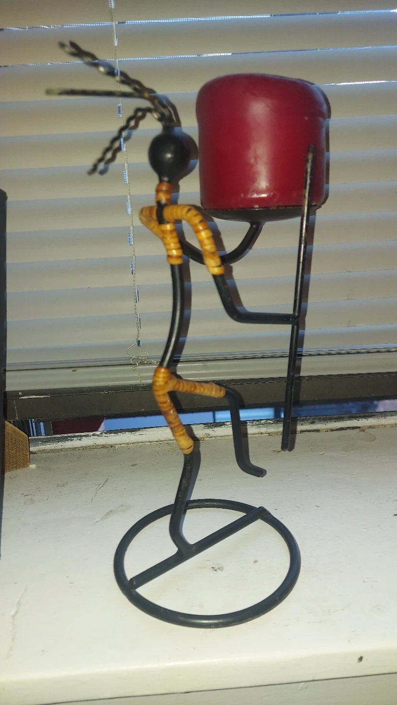 This unique candle holder features a decorative figure made from black metal wire with woven accents. It holds a red pillar candle. Meant size candles can be used. The design is abstract and artistic. It's a striking piece for any table!