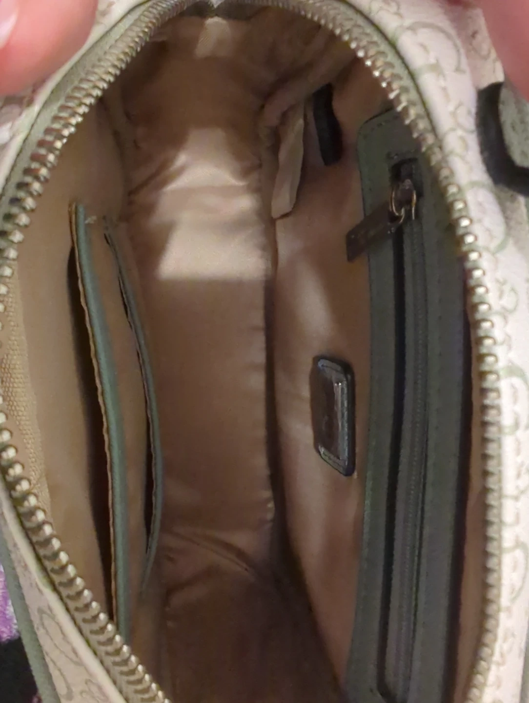 This is a cute discontinued GUESS crossbody bag. It has the all-over G logo print in white and sage green. It comes with a matching coin purse attached to the strap. Interior includes a zippered pocket and slip pockets.