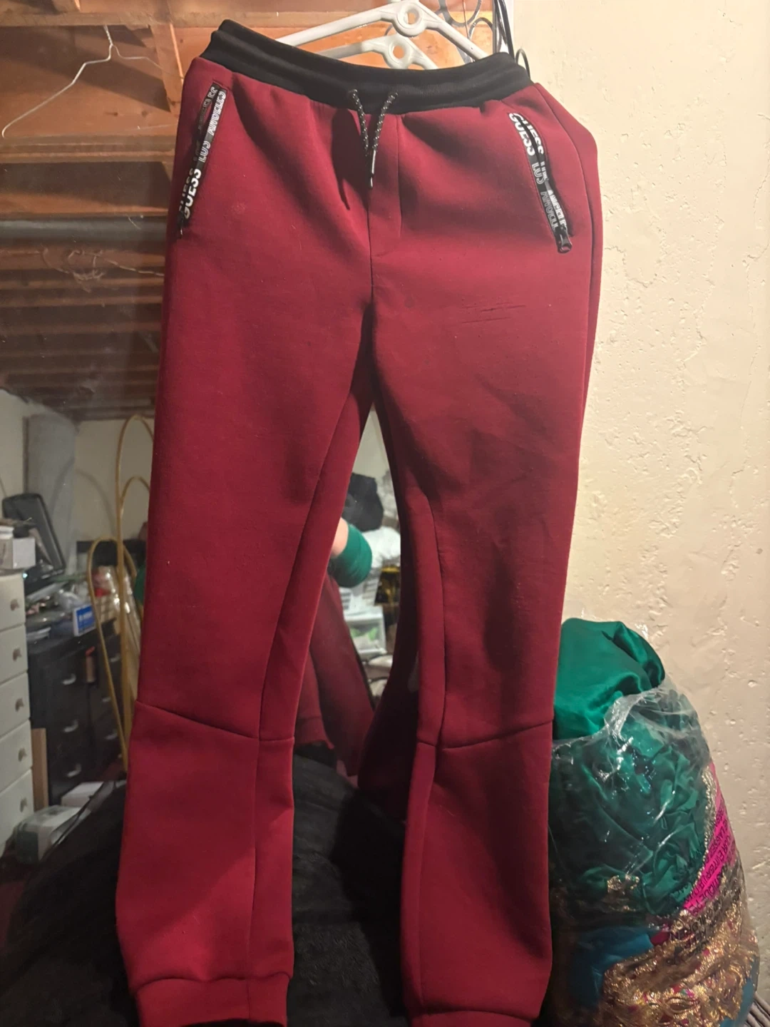 Guess tracksuit jacket in a deep red colour. It's a size 16 and made in Bangladesh. Features zippers and black trim accents.