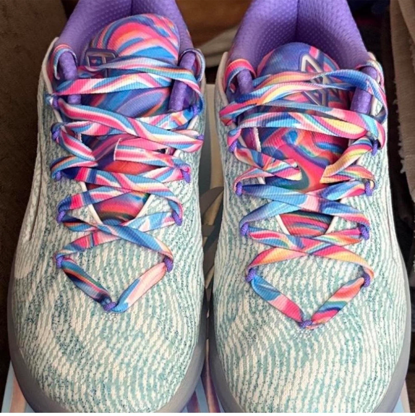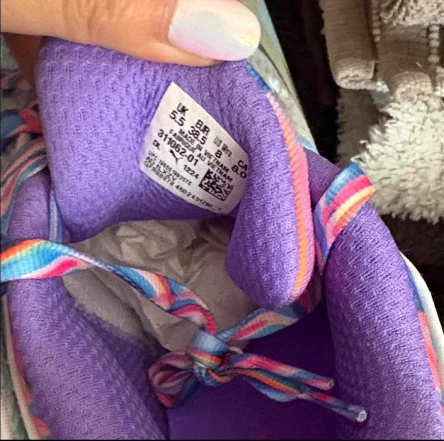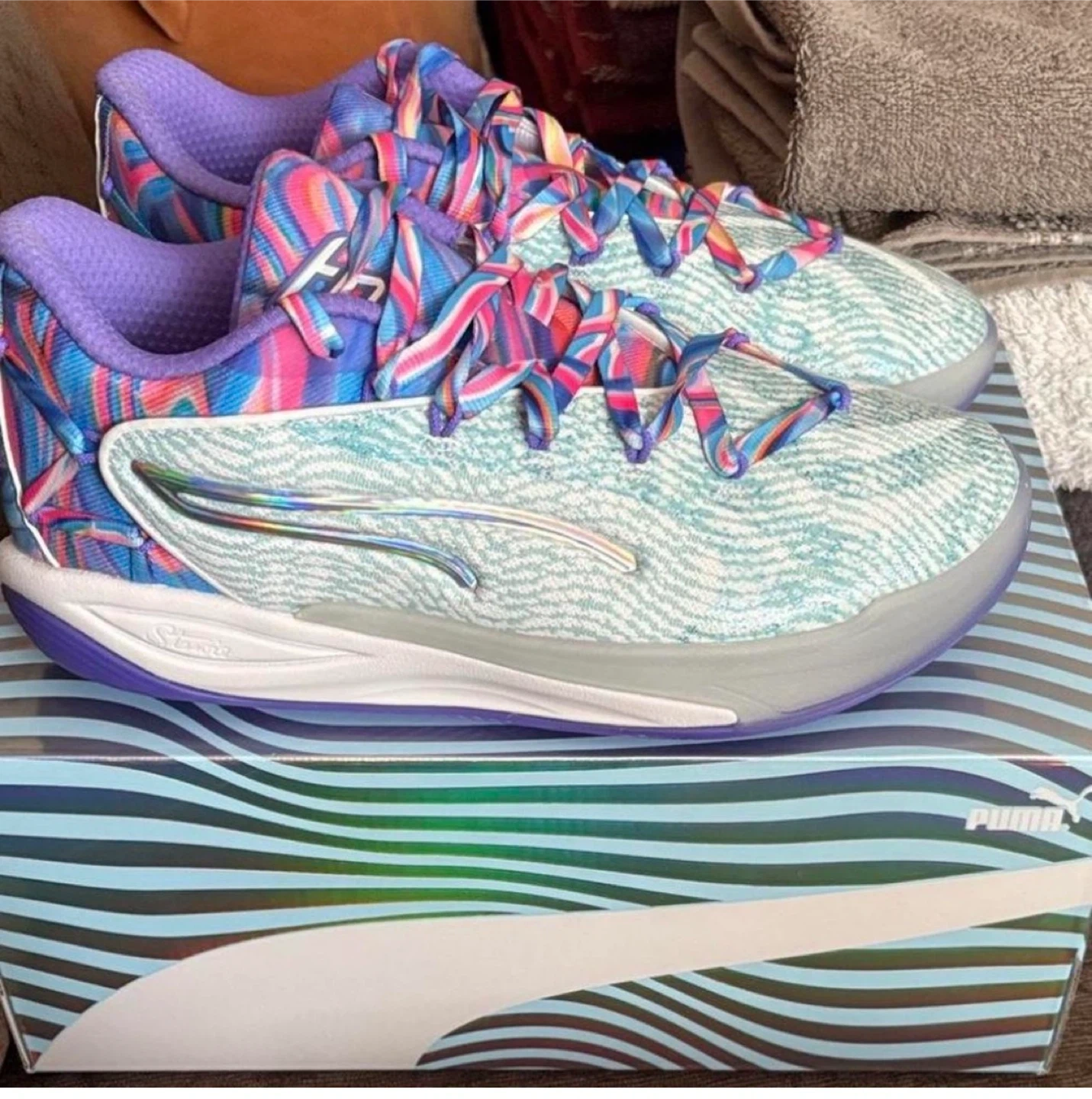 These Puma basketball shoes feature a colourful, marbled pattern on the laces and heel. They are made with a light blue and white patterned upper. Size 5.5 UK, 38.5 EU, 8 US.