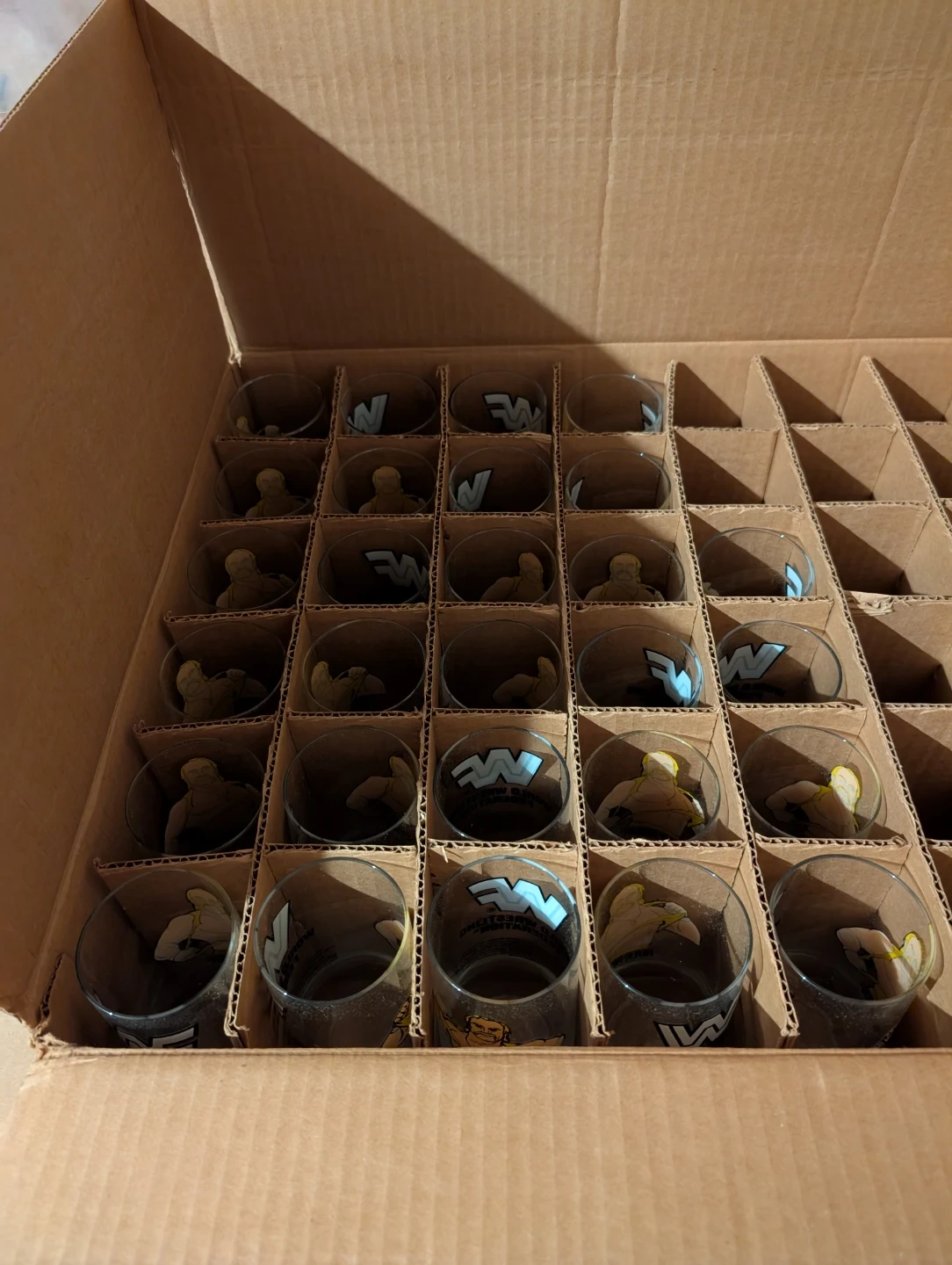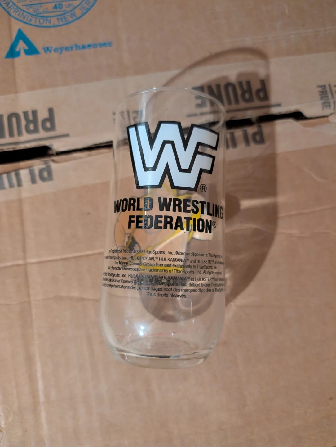 Vintage WWF/WWE glass cups featuring Hulk Hogan. It's made of clear glass with a printed design. This glass is great for collectors or fans of wrestling memorabilia! There are 28 cups.