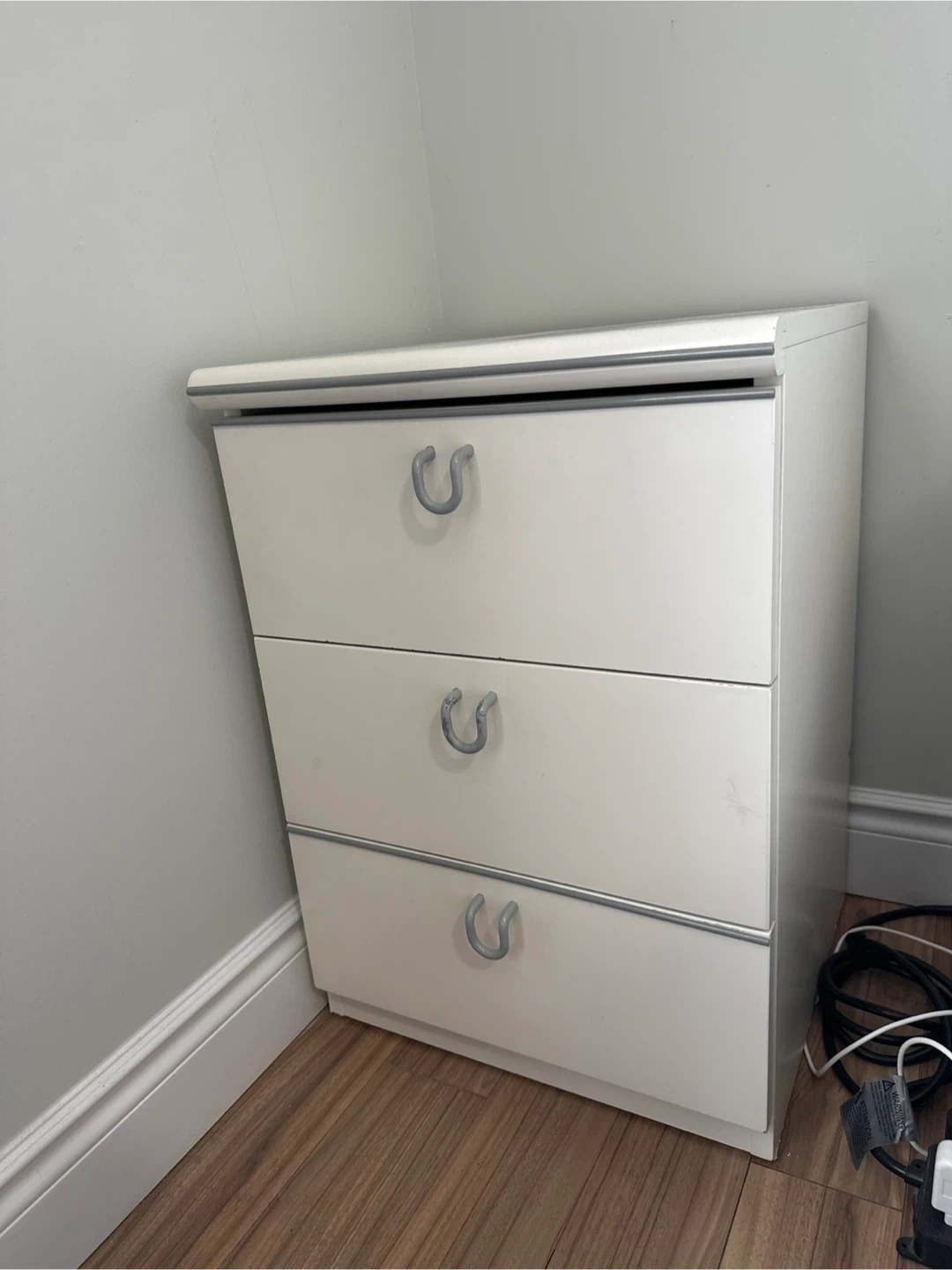 White three-drawer chest with silver trim and U-shaped drawer pulls. It's a compact storage solution. I am selling two of them.