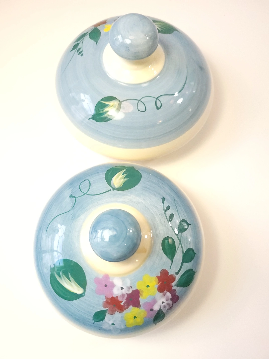 General: Minor "flea bites" (tiny glaze nicks) on the inner rims and light shelf wear on the bases consistent with age.