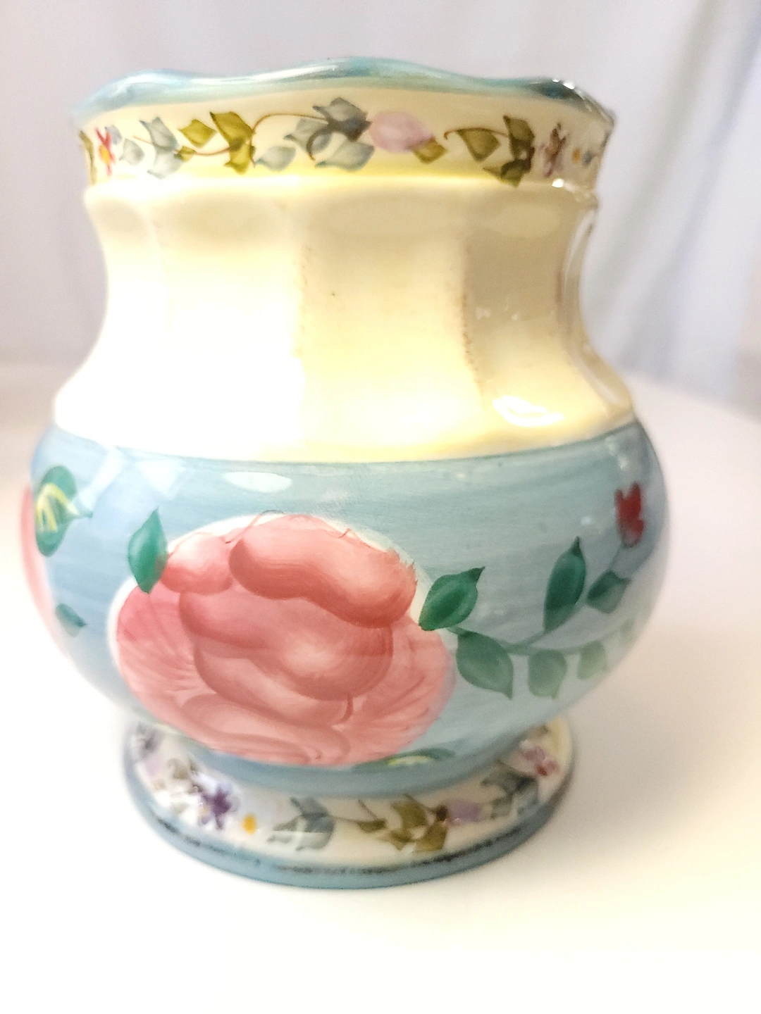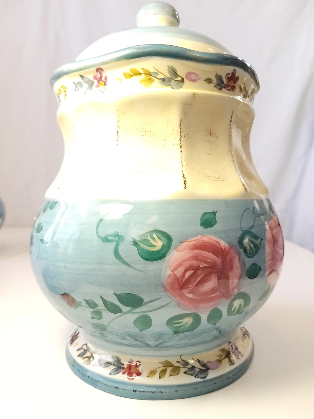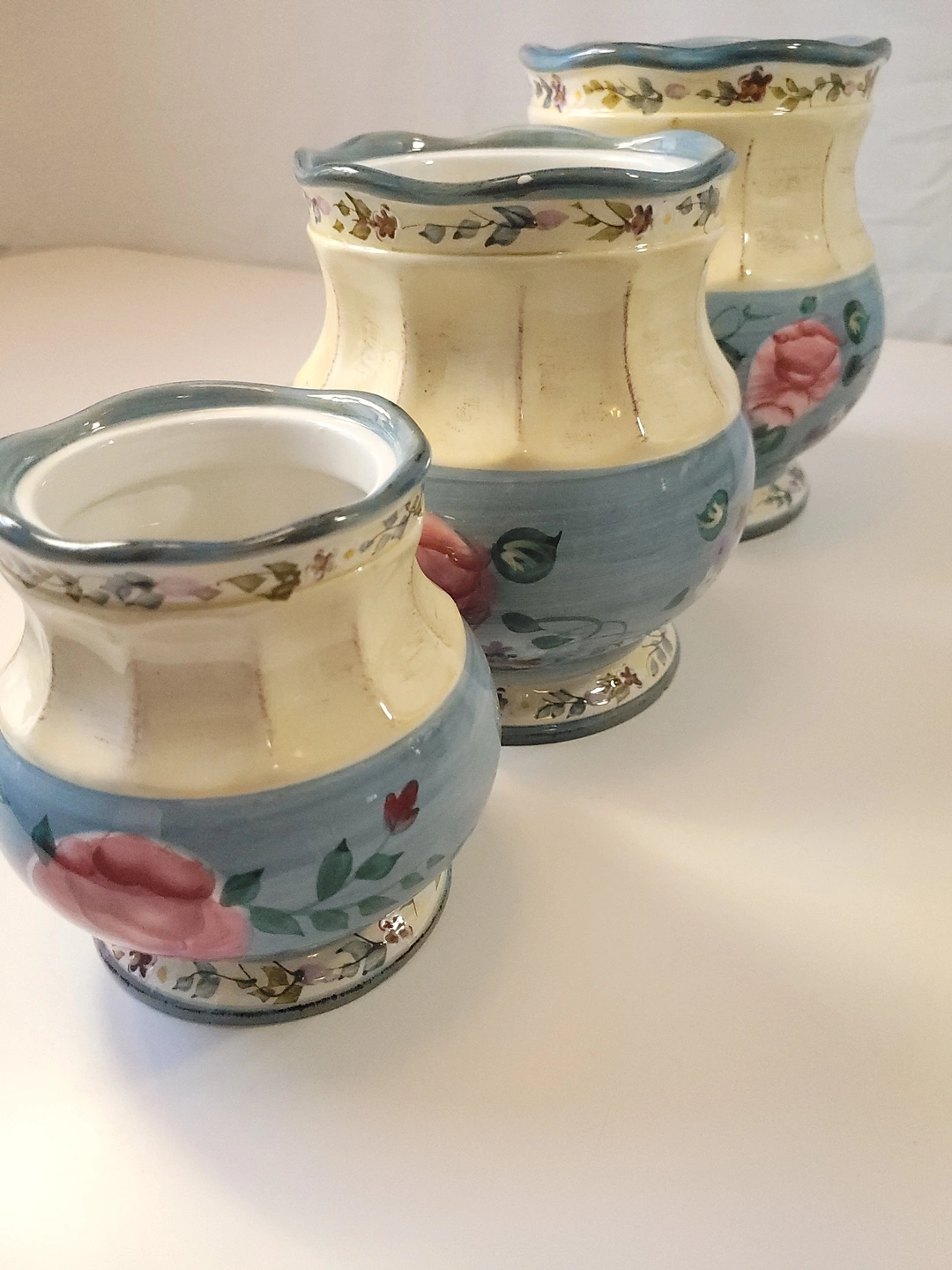 A beautiful addition to any farmhouse or shabby chic kitchen. This set features embossed vertical ribbing, a creamy ivory body, and soft blue accents with hand-painted pink roses and floral sprays.