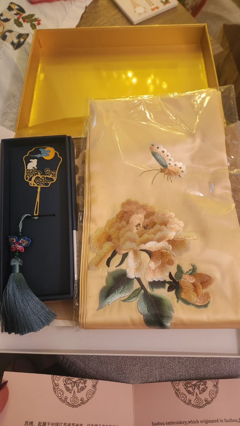 This is a beautiful Suzhou embroidery scarf set, still in its original packaging! The set includes a scarf with a delicate floral and butterfly design, and a matching hair accessory. The embroidery is incredibly detailed and showcases the rich cultural heritage of Suzhou craftsmanship. This would make a lovely gift or a special addition to your wardrobe