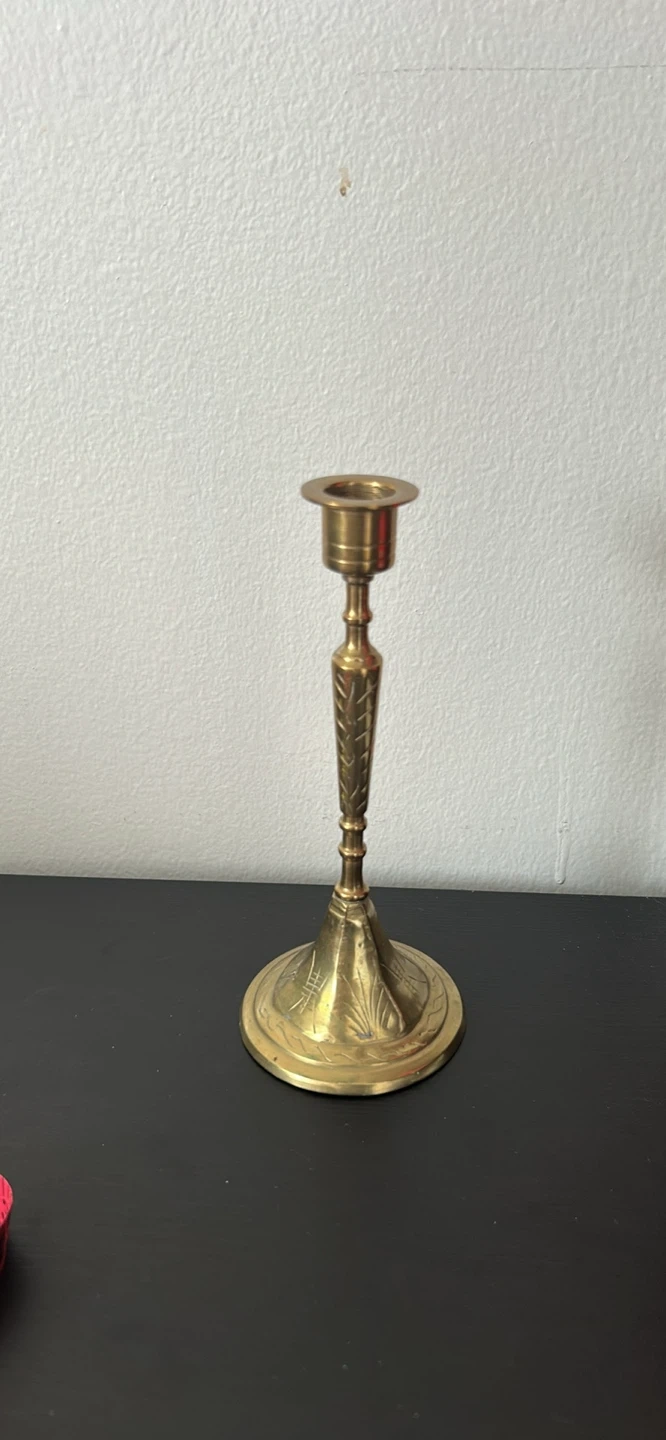 This is a decorative brass candlestick holder with an ornate stem and base. It's designed to hold a standard taper candle. The metal has a warm, golden finish.