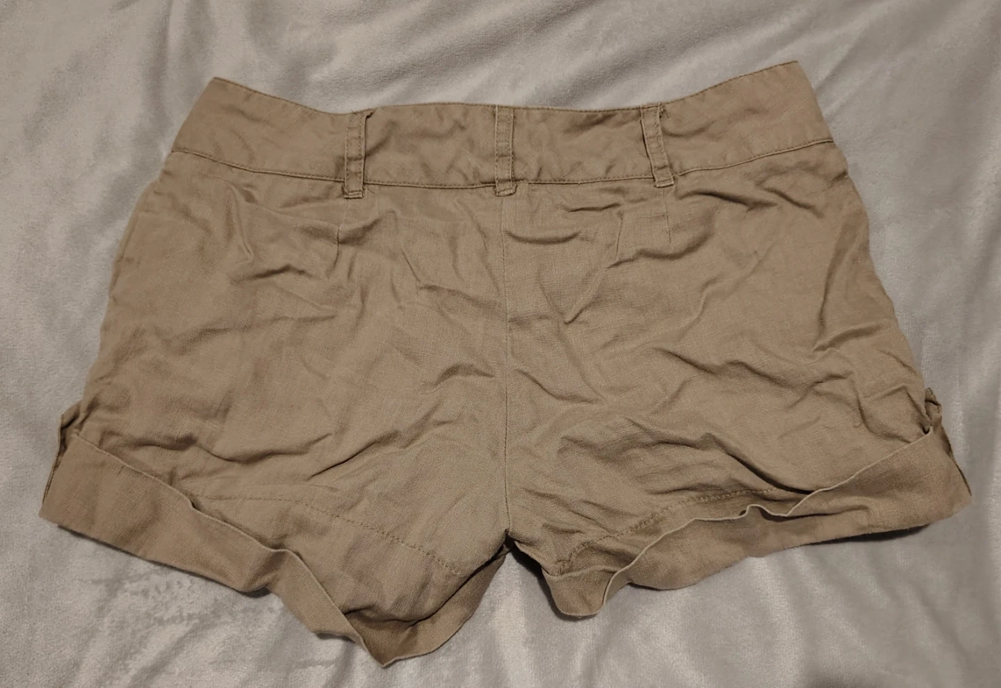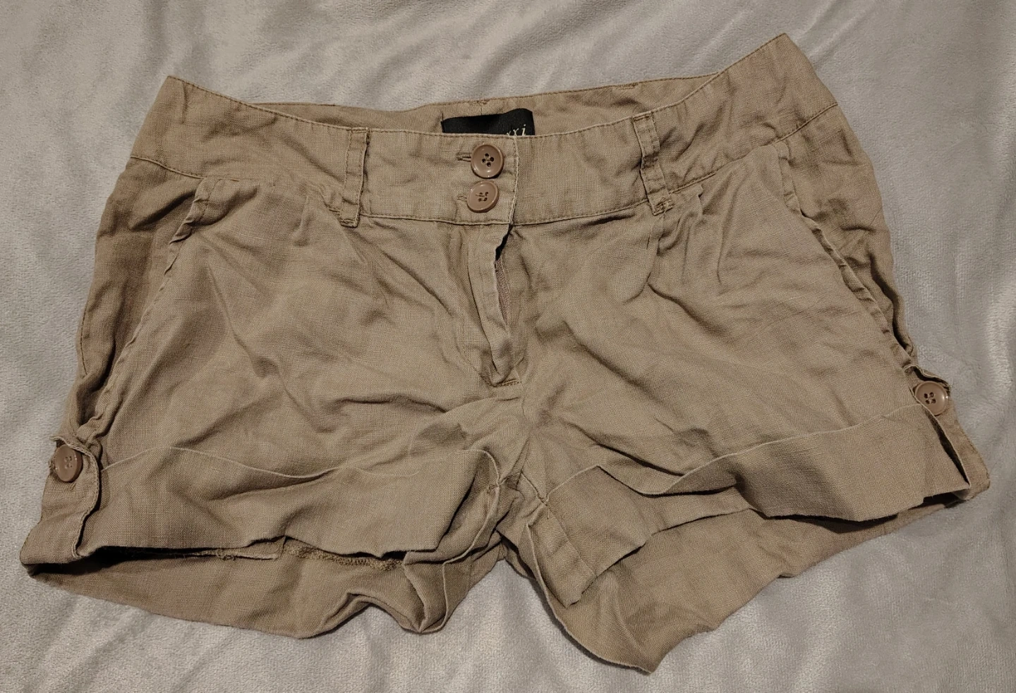 Casual tan shorts with a comfortable linen blend fabric. These shorts feature button closure, cuffed hems, and adjustable side tabs. They're perfect for warm weather outings! Y2K vibes