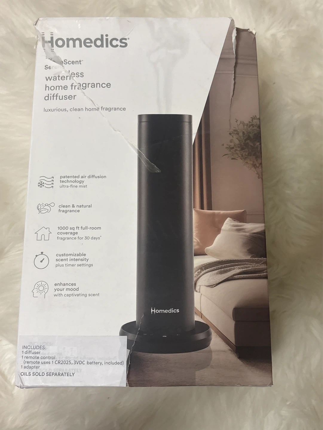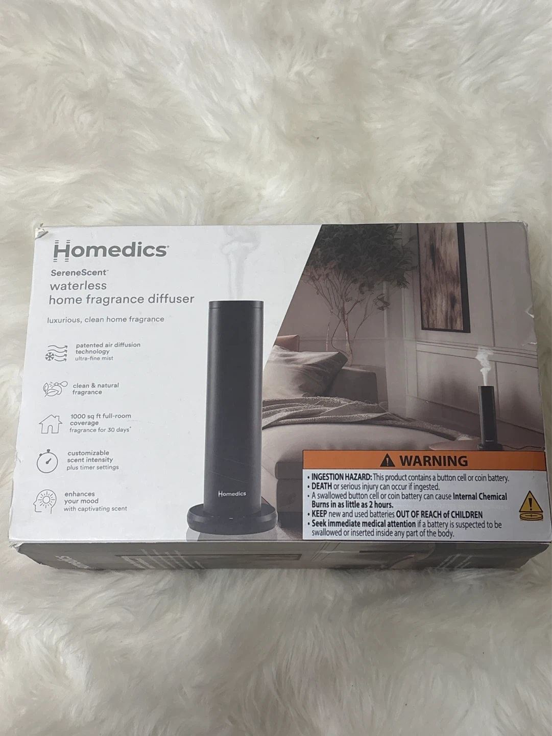 HoMedics SereneScent waterless home fragrance diffuser with patented air diffusion technology. It covers 1000 sq ft full-room and provides fragrance for 30 days. Customizable scent intensity with timer settings.