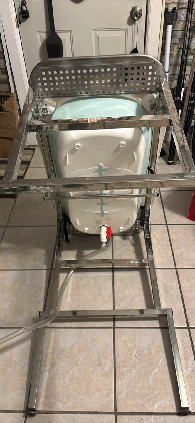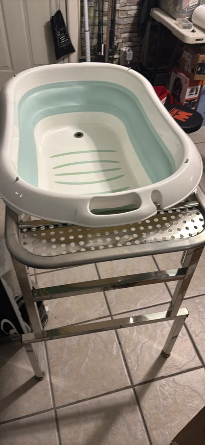 This is a collapsible baby bathtub with a stainless steel stand. It's white and light blue. The tub is made of plastic and includes a drain plug. The stand is foldable for easy storage.
