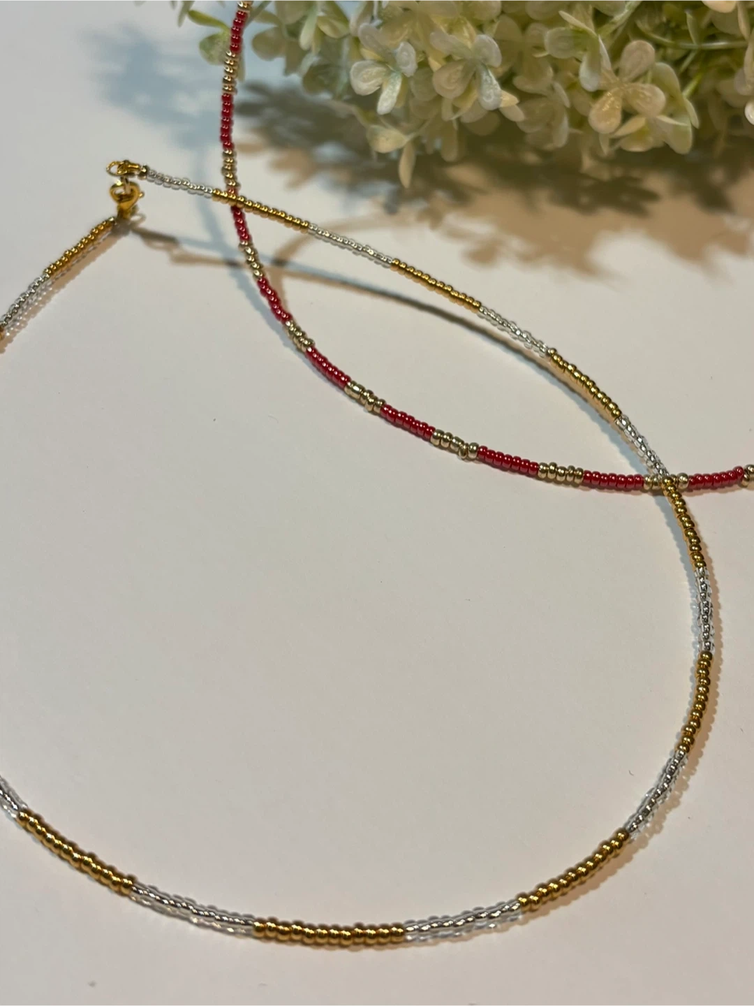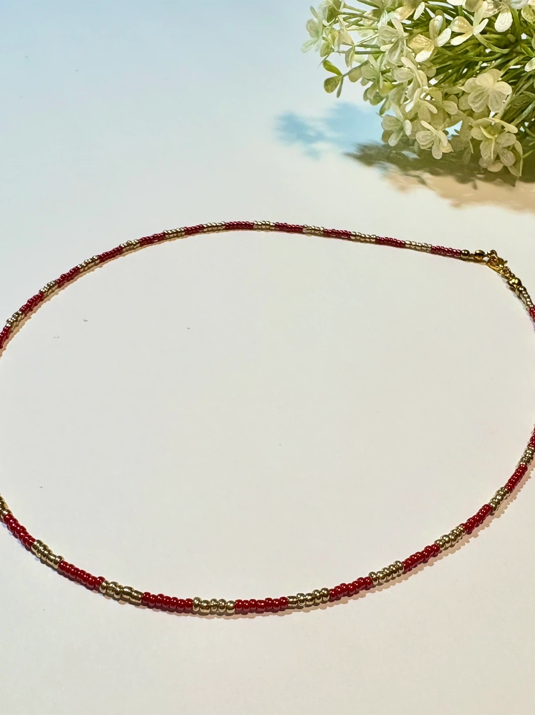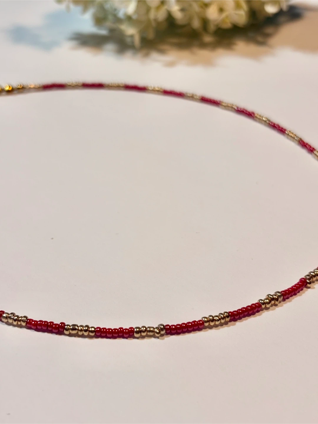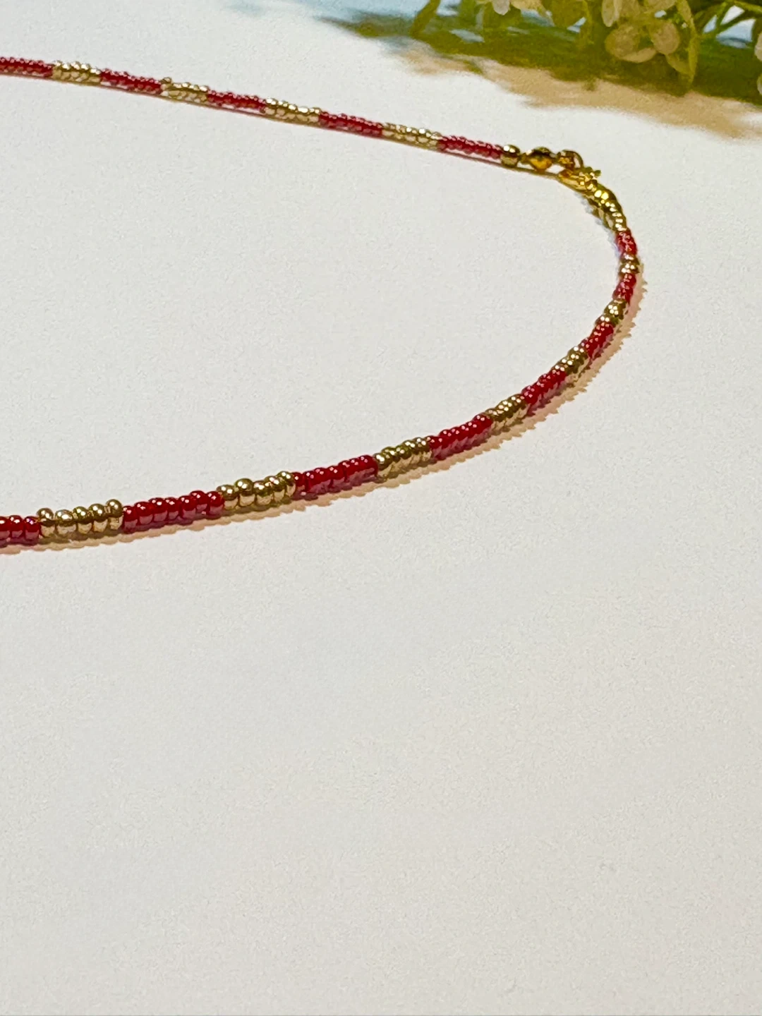Handmade choker style beaded necklace featuring red and gold beads or gold and white beads. It's perfect for adding a touch of elegant/minimalist to any outfit!